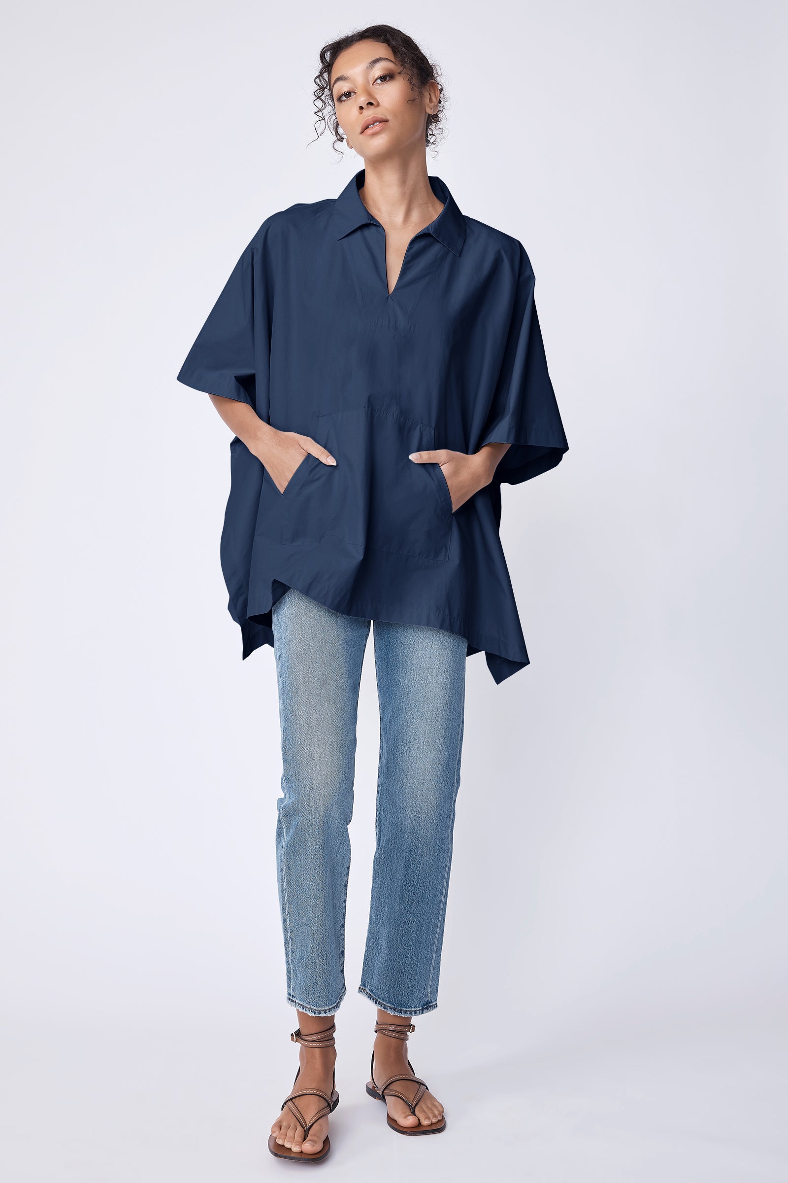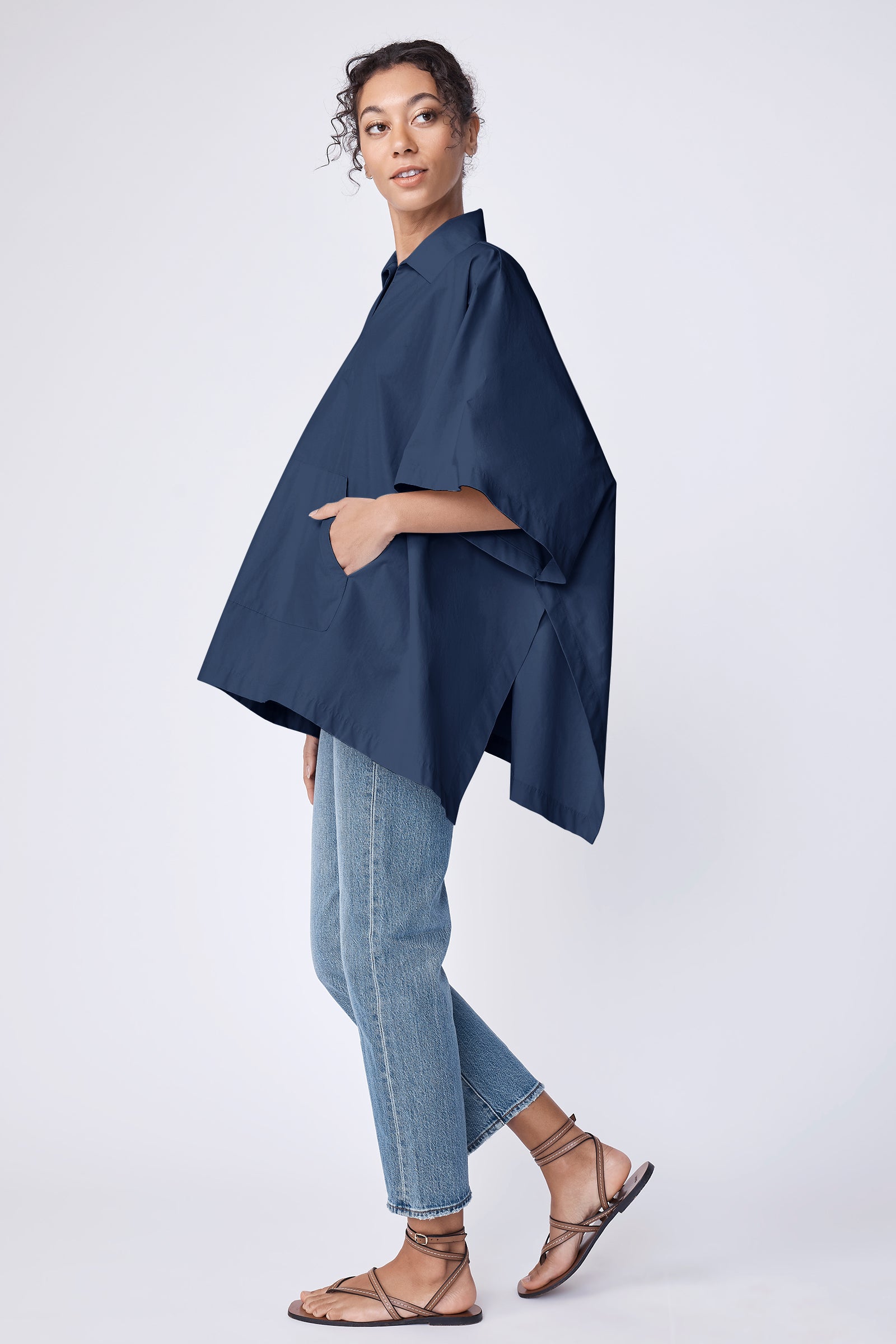 The Gene Pocket Poncho is cut in Italian Broadcloth for structure without weight. With a flat lay collar, oversized front pocket, and side button closure, it’s versatile enough to layer over jeans, dresses, or travel staples—your go-to piece when you want polish without fuss.