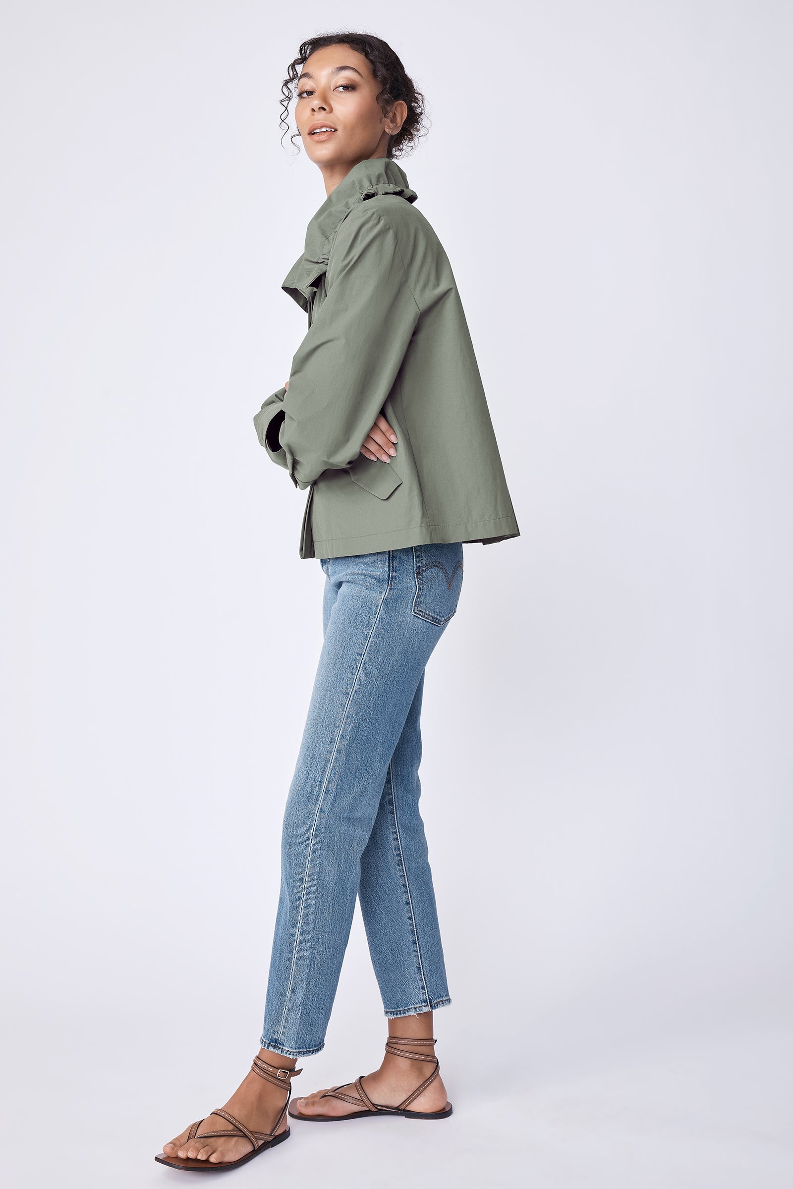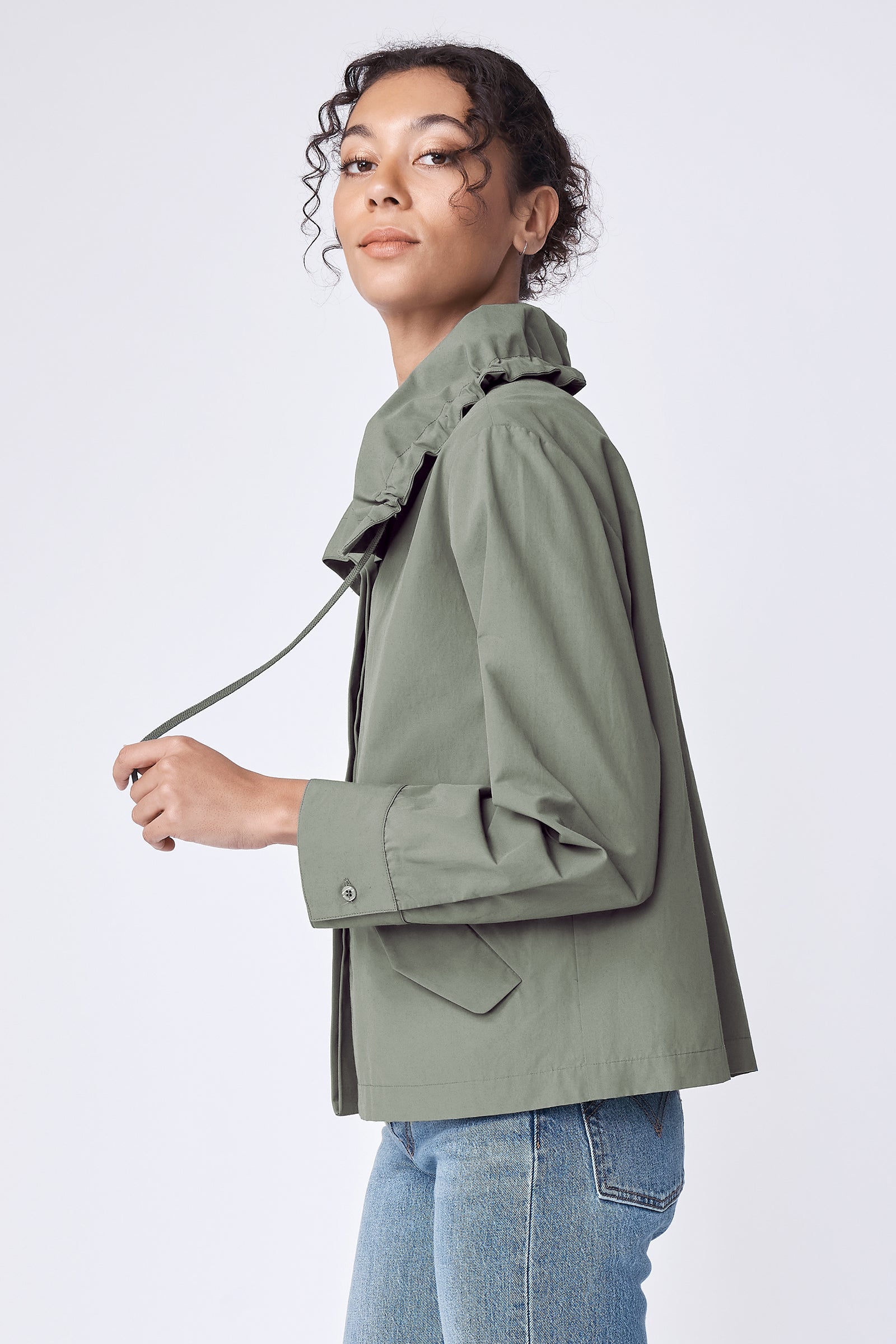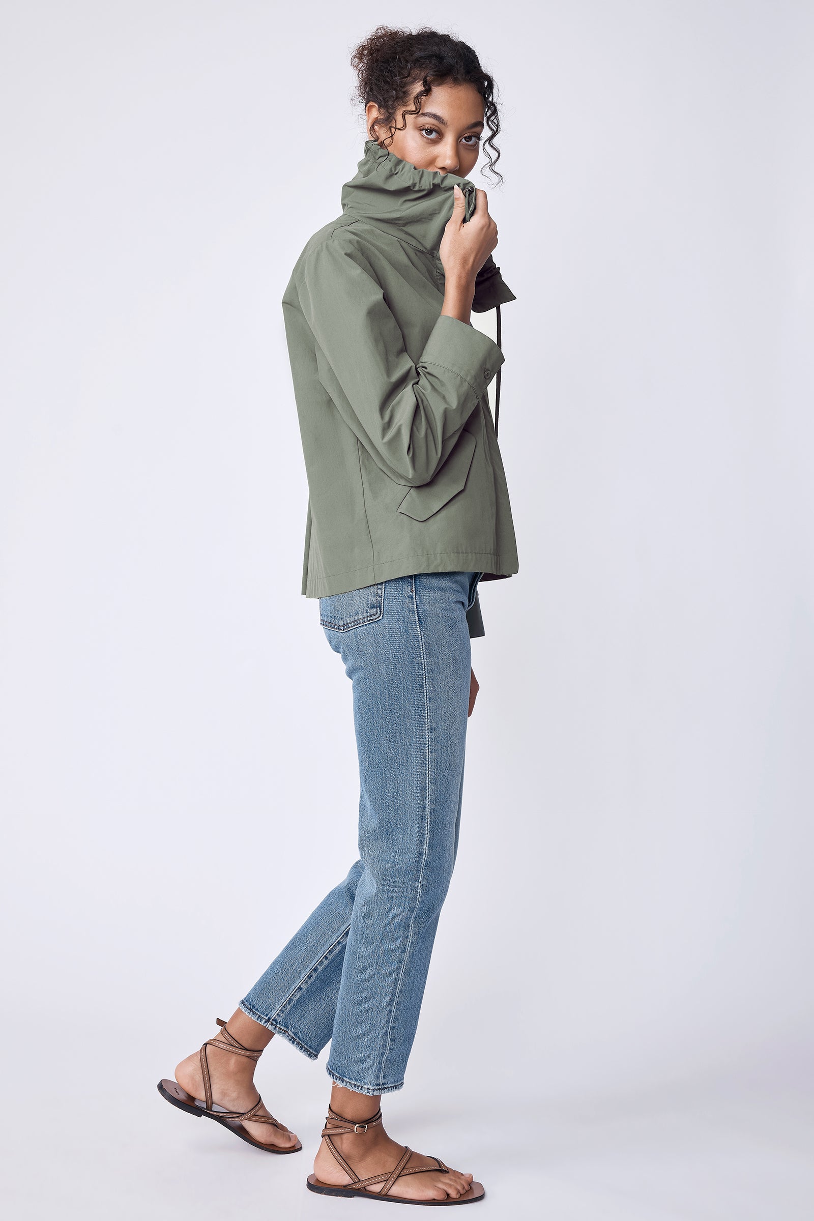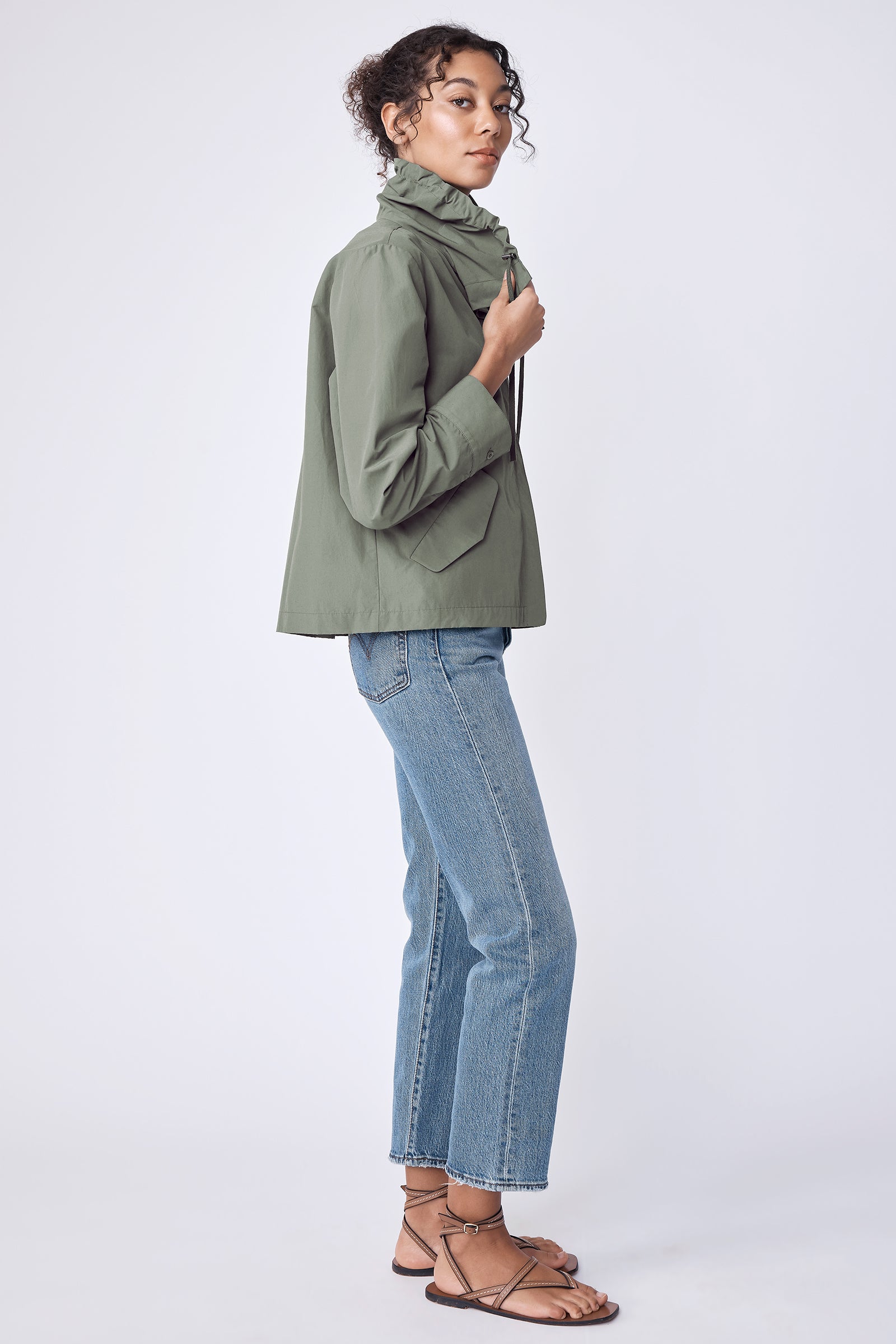 Center front hidden button closure, high open collar with drawstring detail and toggles, front angled flap pockets, full sleeve with single button cuff, center back pleat with stitch down detail, clean finish straight hem