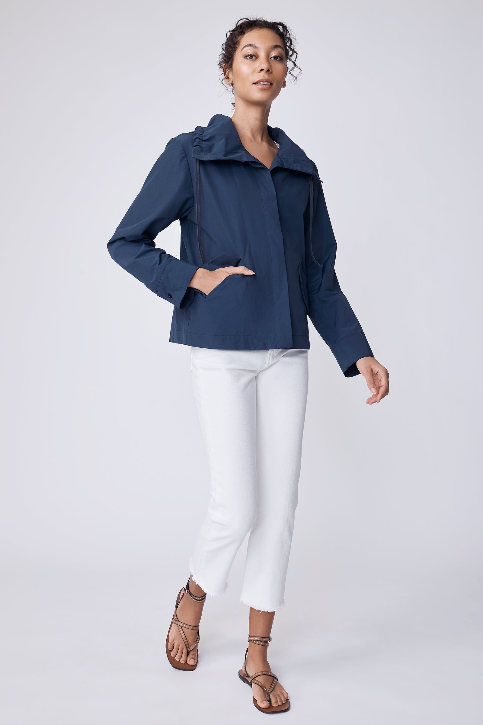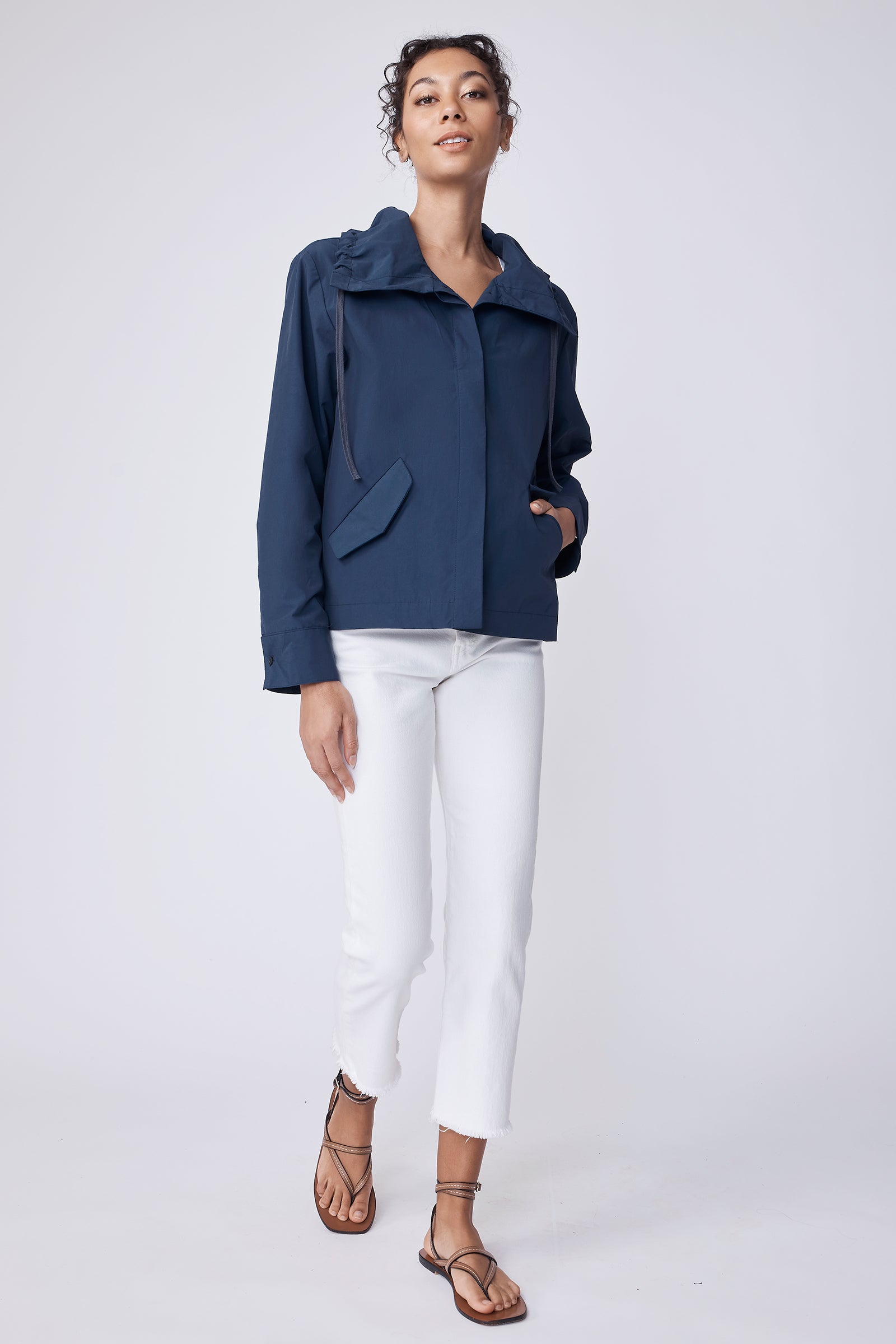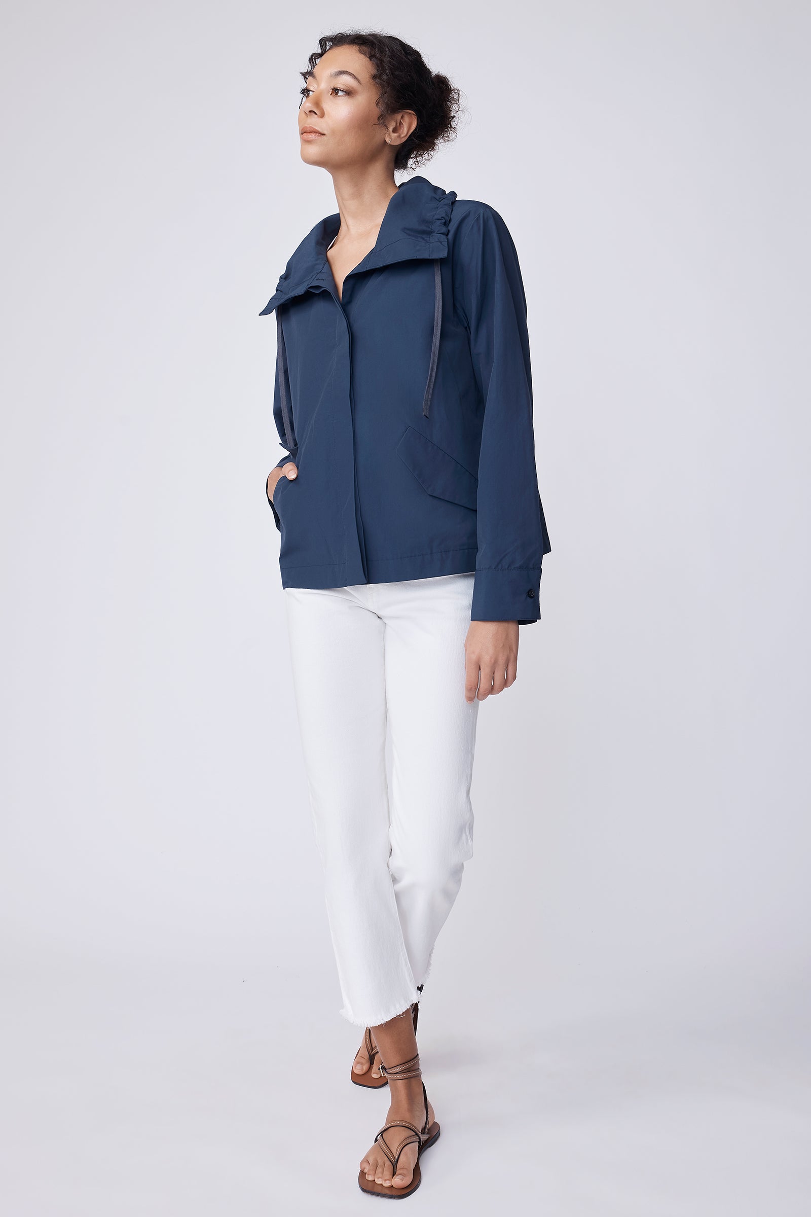 Center front hidden button closure, high open collar with drawstring detail and toggles, front angled flap pockets, full sleeve with single button cuff, center back pleat with stitch down detail, clean finish straight hem