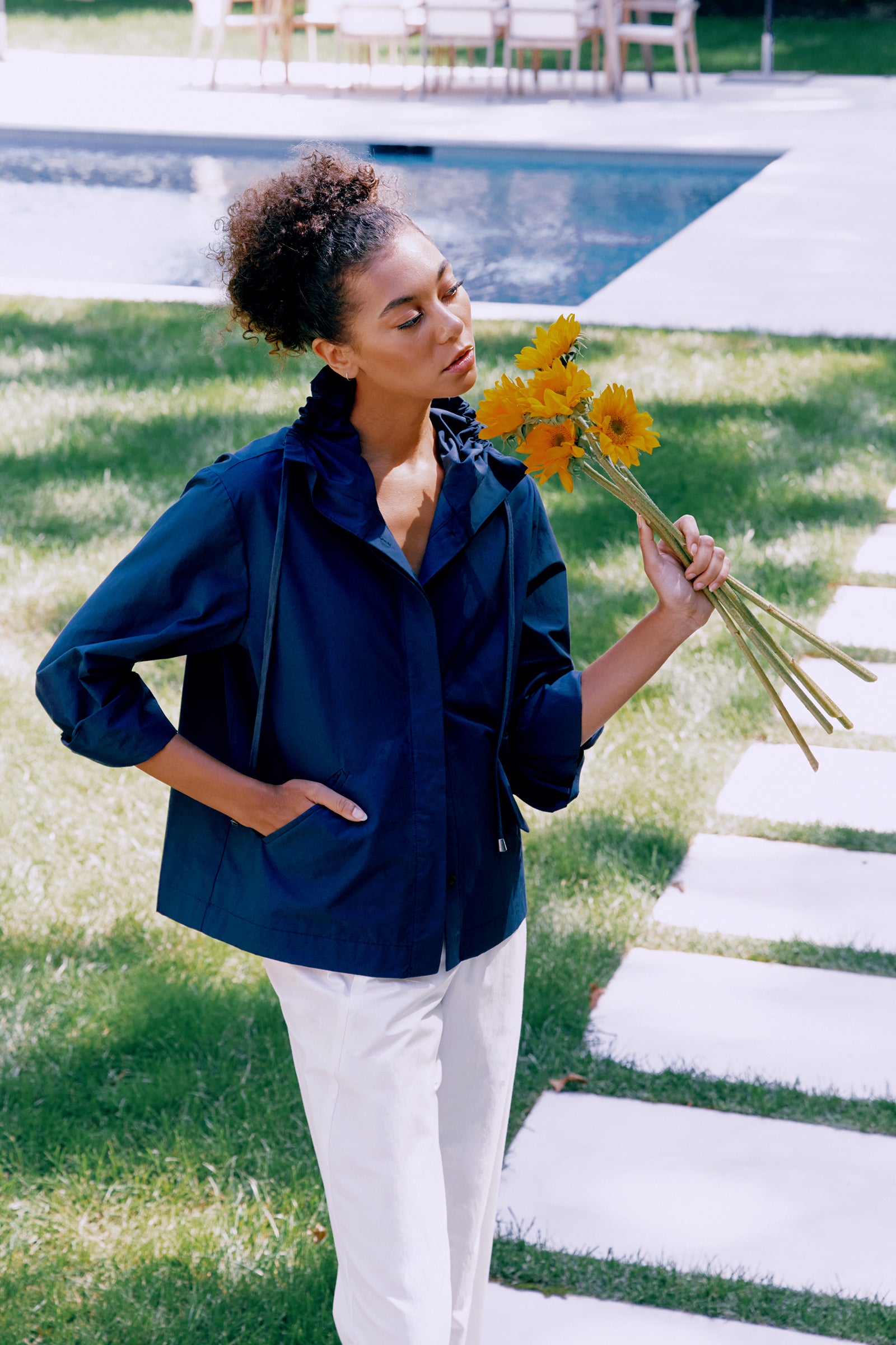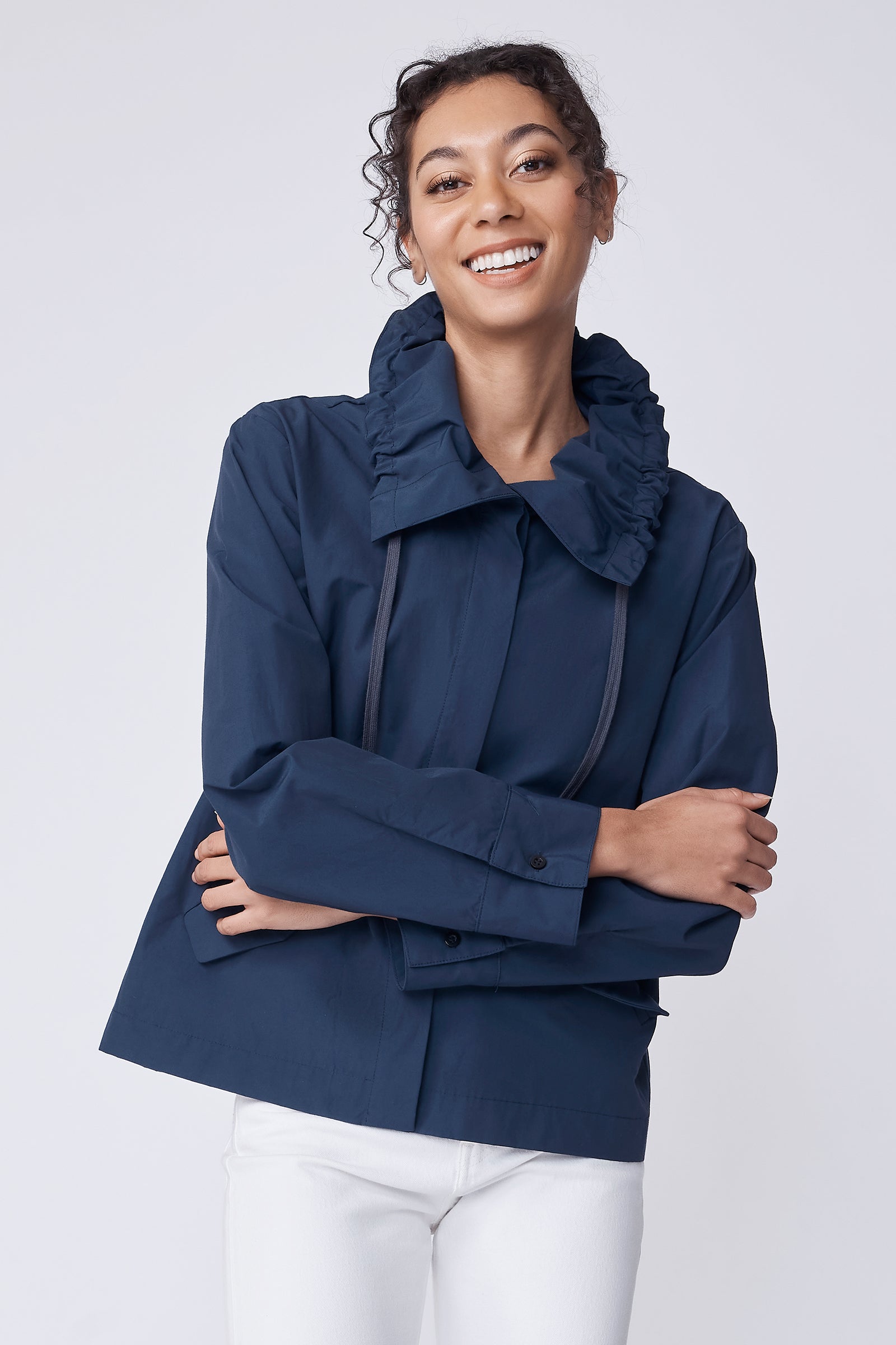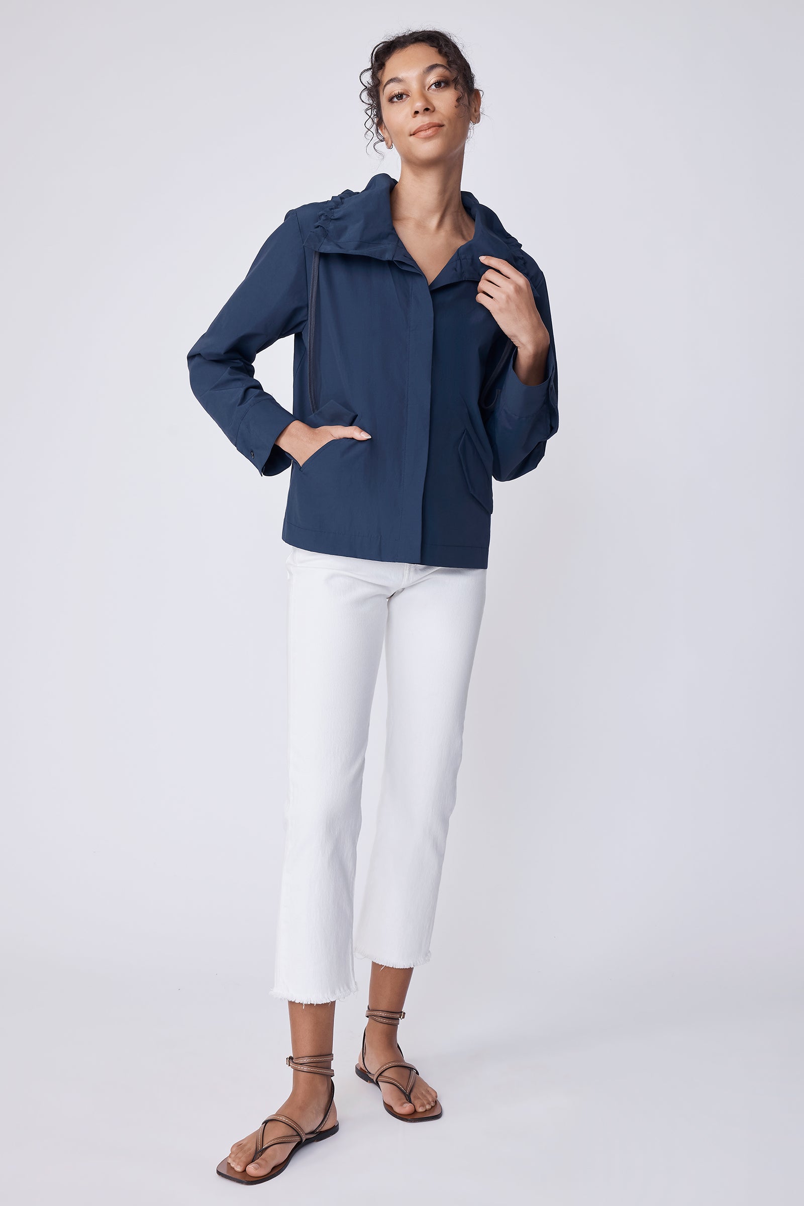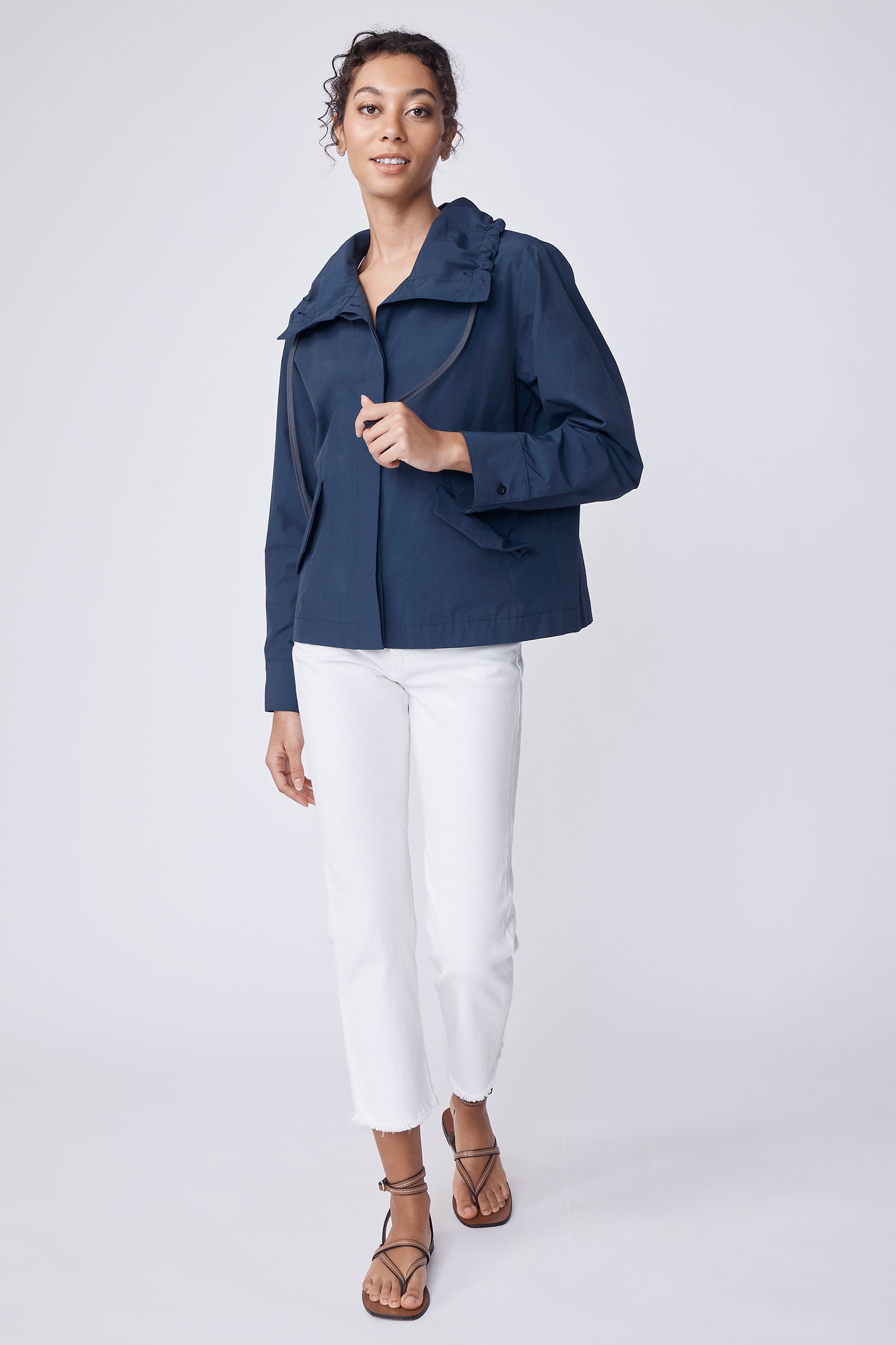 Center front hidden button closure, high open collar with drawstring detail and toggles, front angled flap pockets, full sleeve with single button cuff, center back pleat with stitch down detail, clean finish straight hem