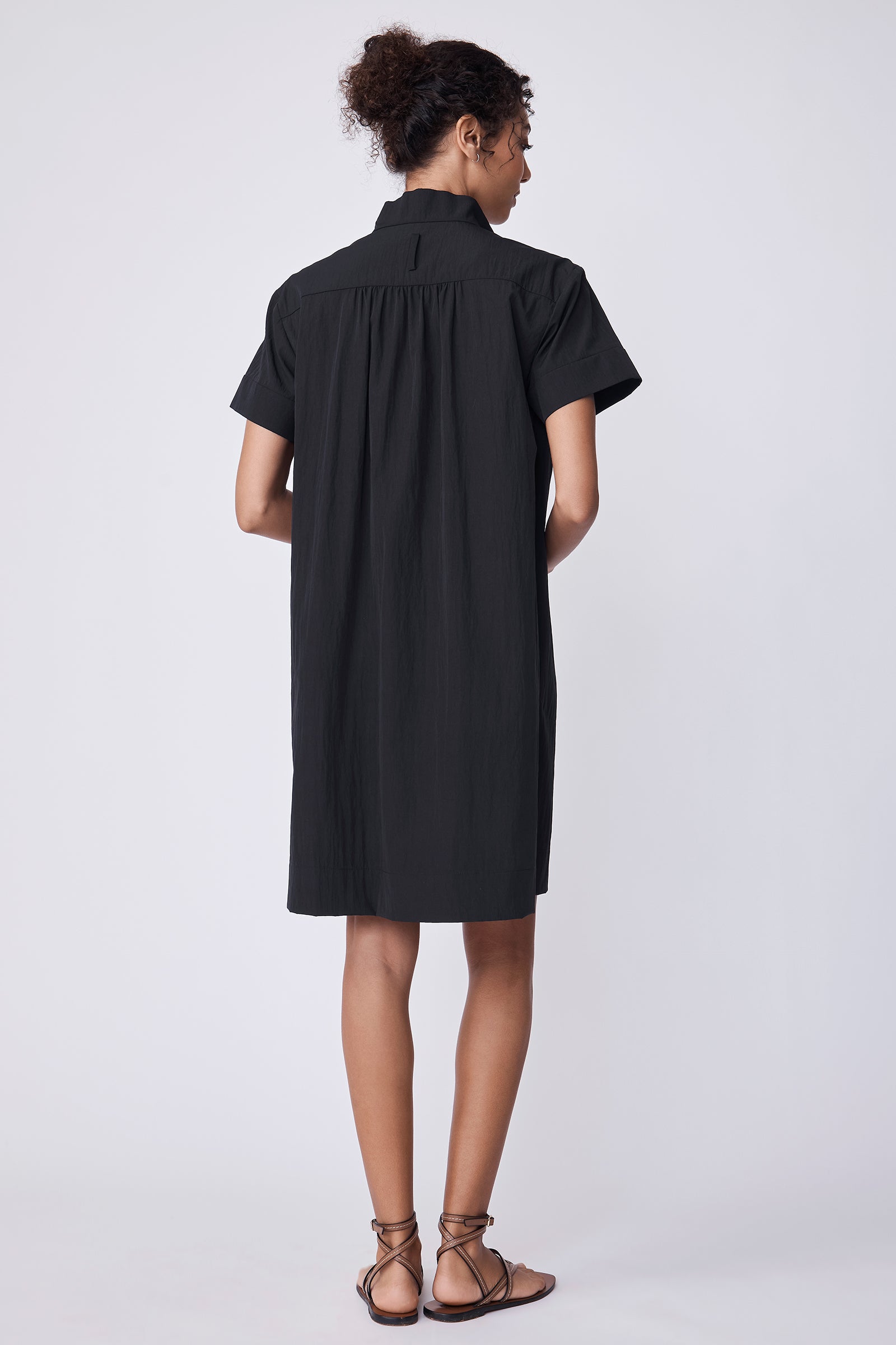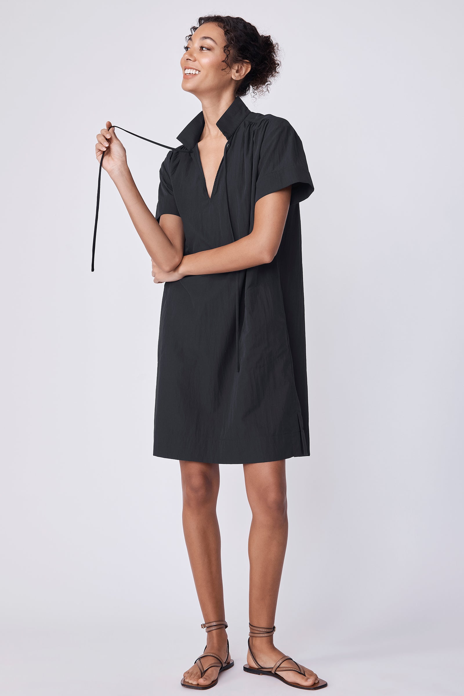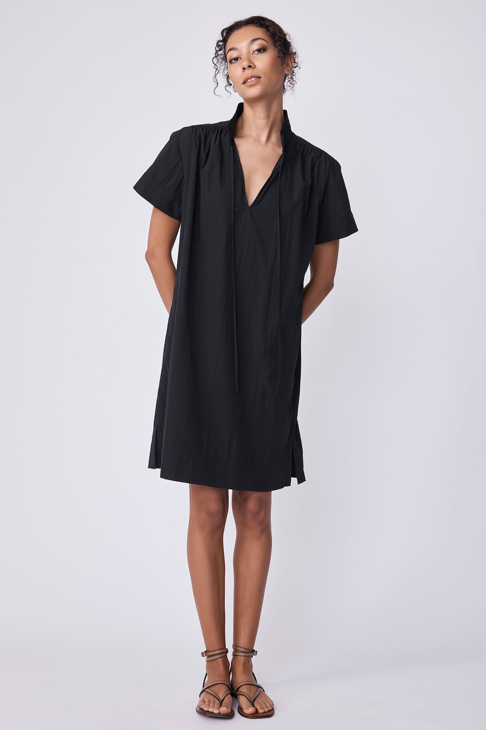 V-neck shape with stand collar, wide yoke with shirring detail along front and back, self front ties, slight drop shoulder with short sleeve length, clean finish hem