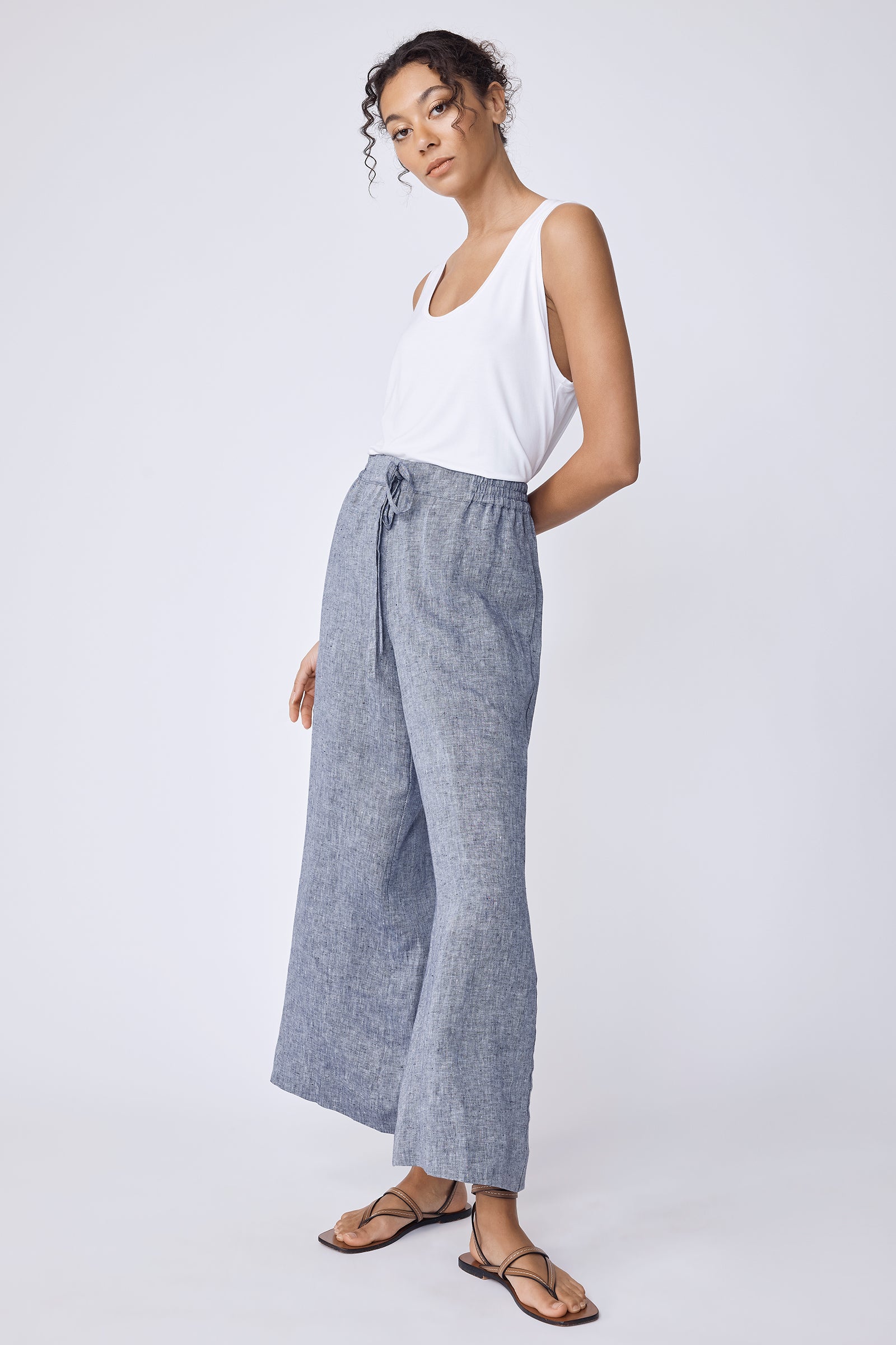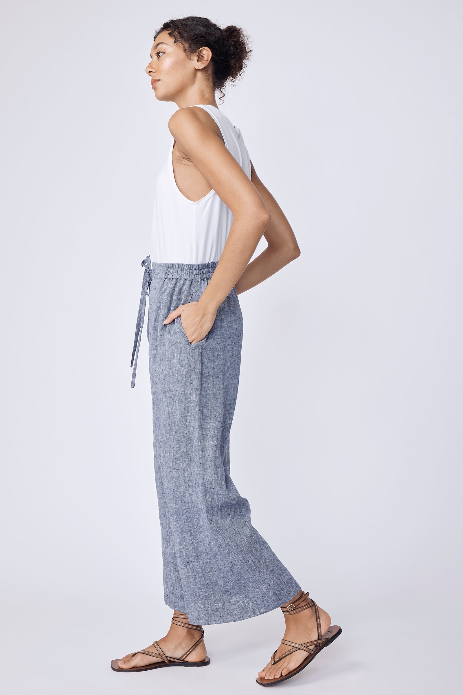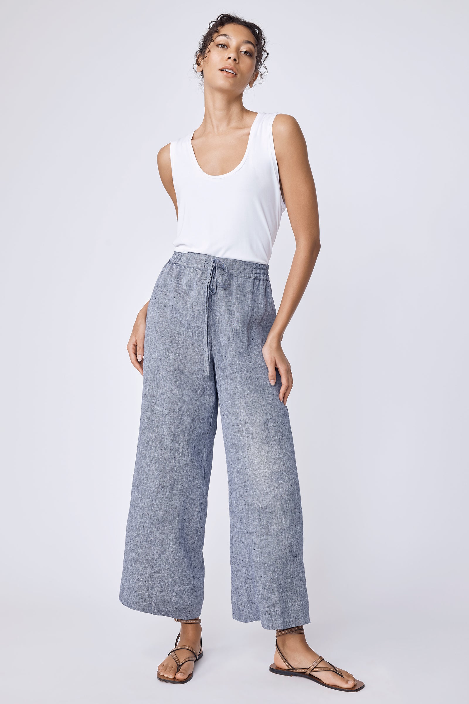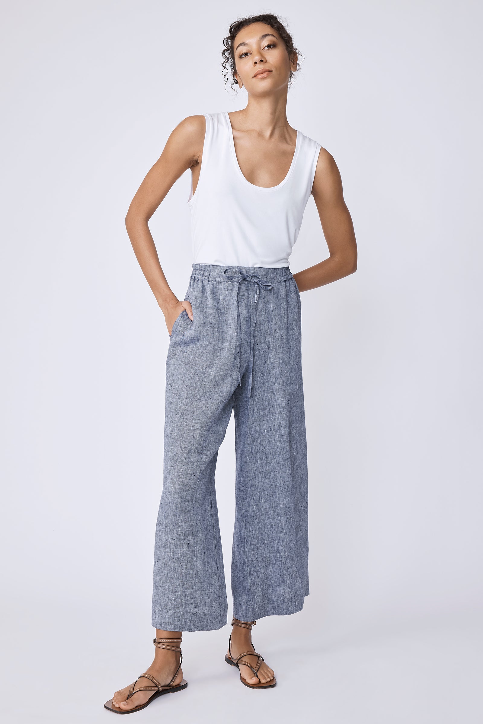 2" waistband with topstitch elastic and drawstring, on seam front pockets, cropped wide leg finish, clean finish hem
