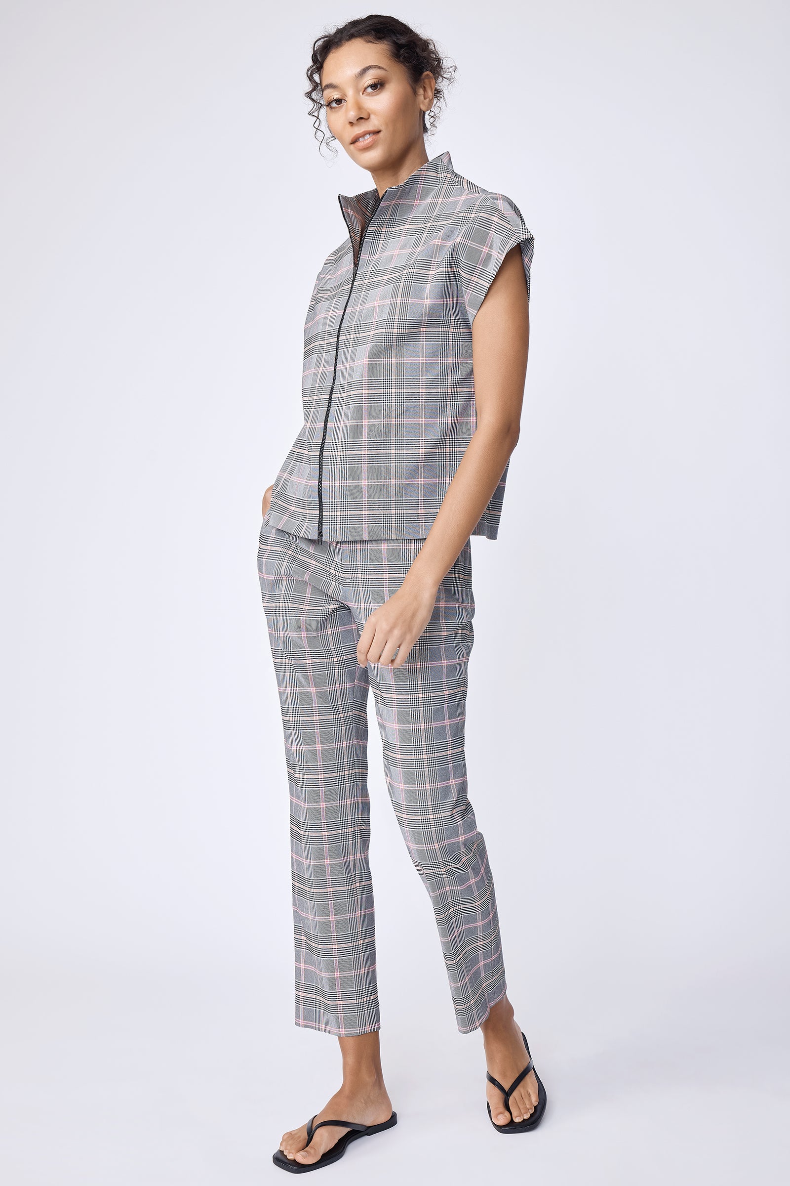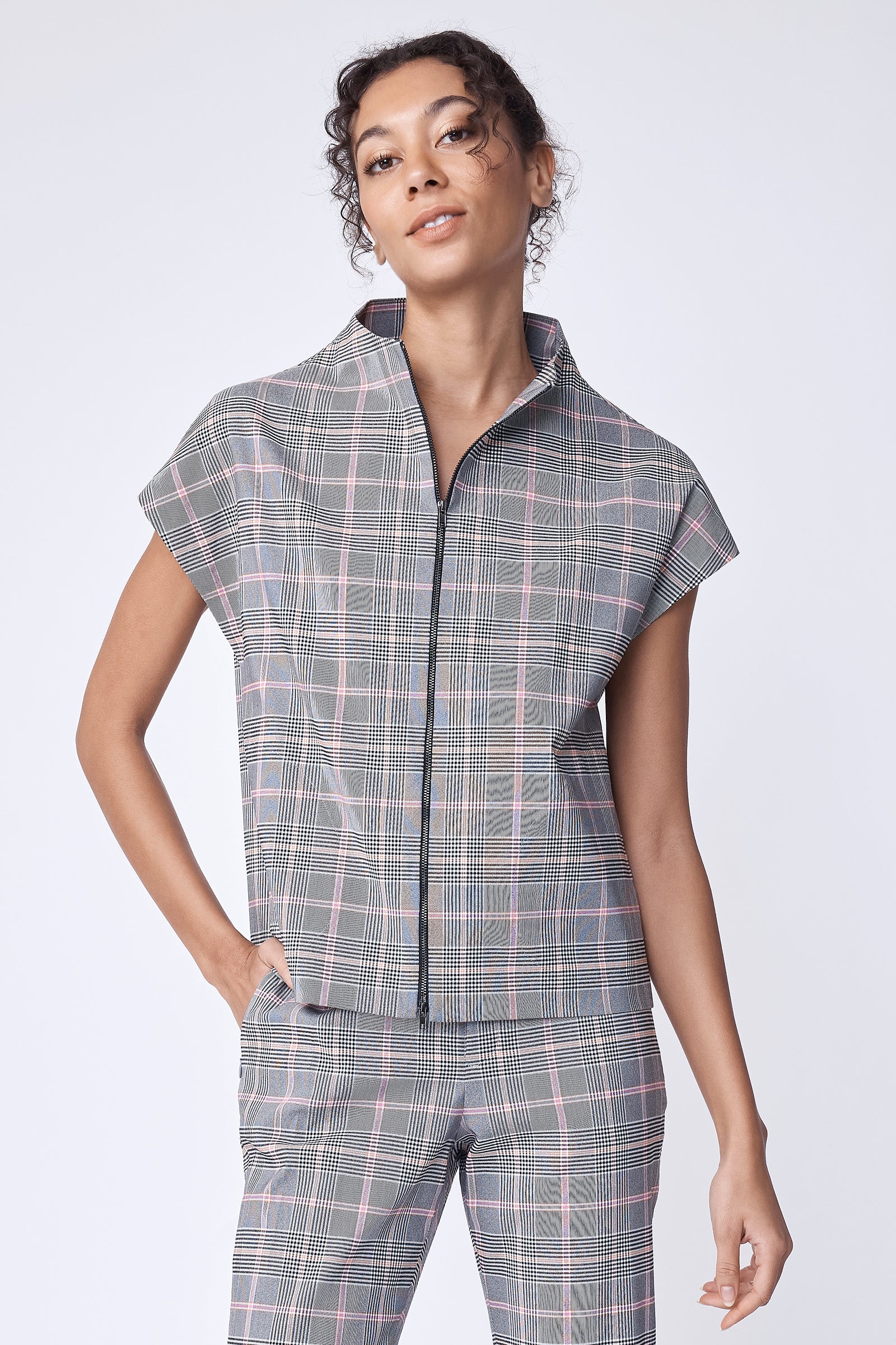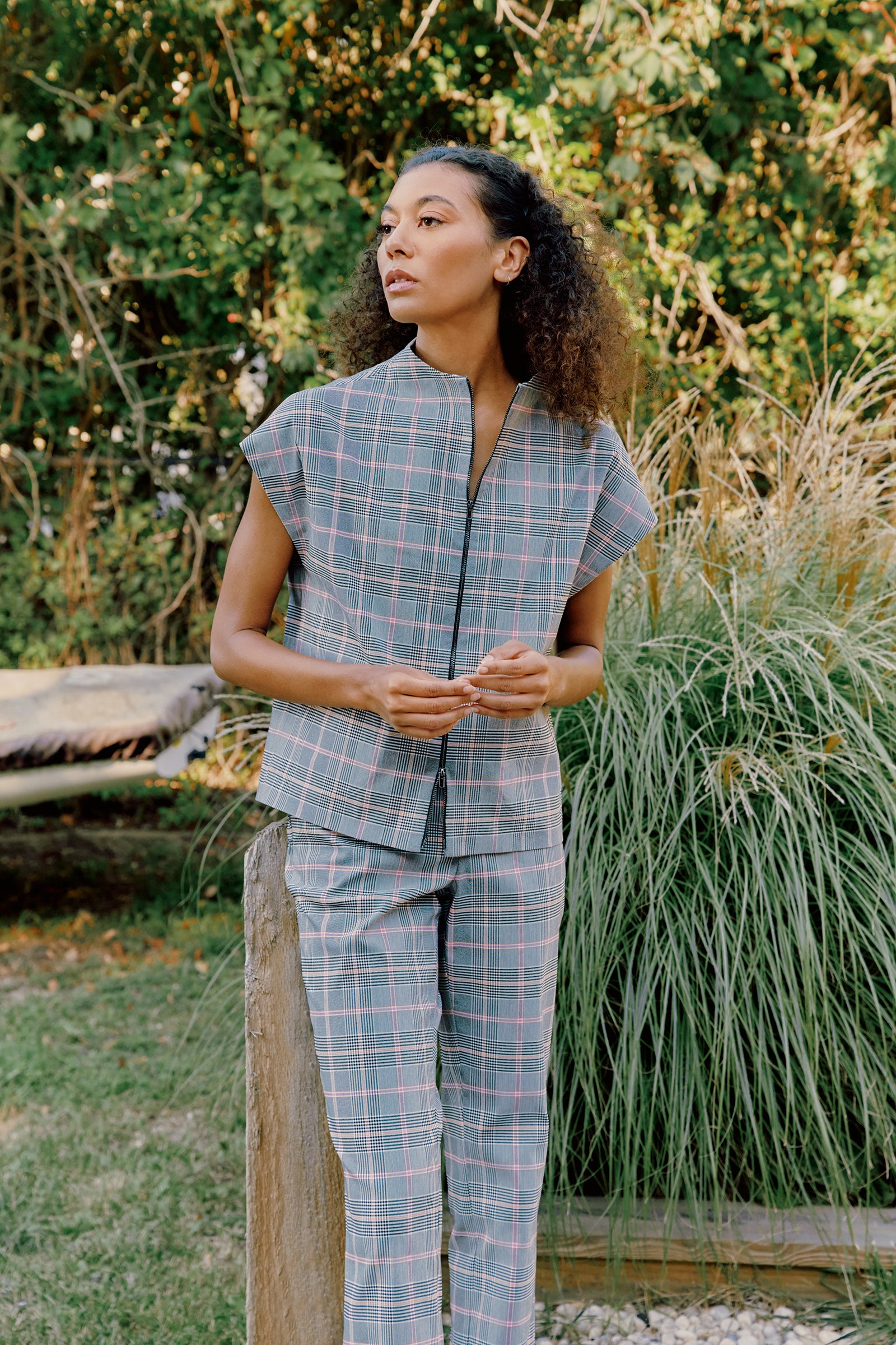 The Lena Zip Vest, crafted in seasonal stretch plaids, is lightweight with a soft hand and just enough structure to pull a look together. Throw it over a tee or a tailored shirt for cooler mornings and breezy evenings. It’s the kind of piece that lives by the door and earns repeat wear.
