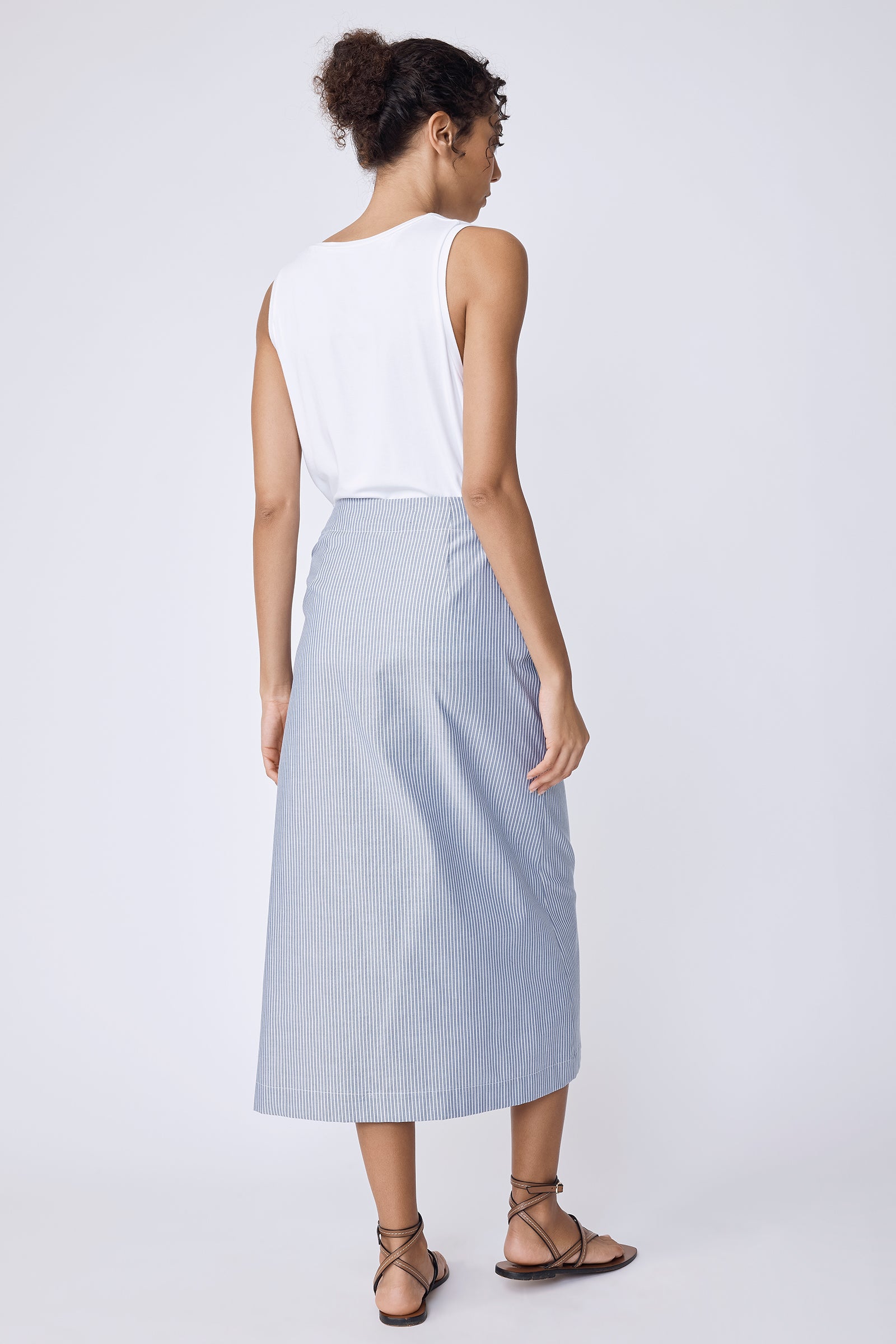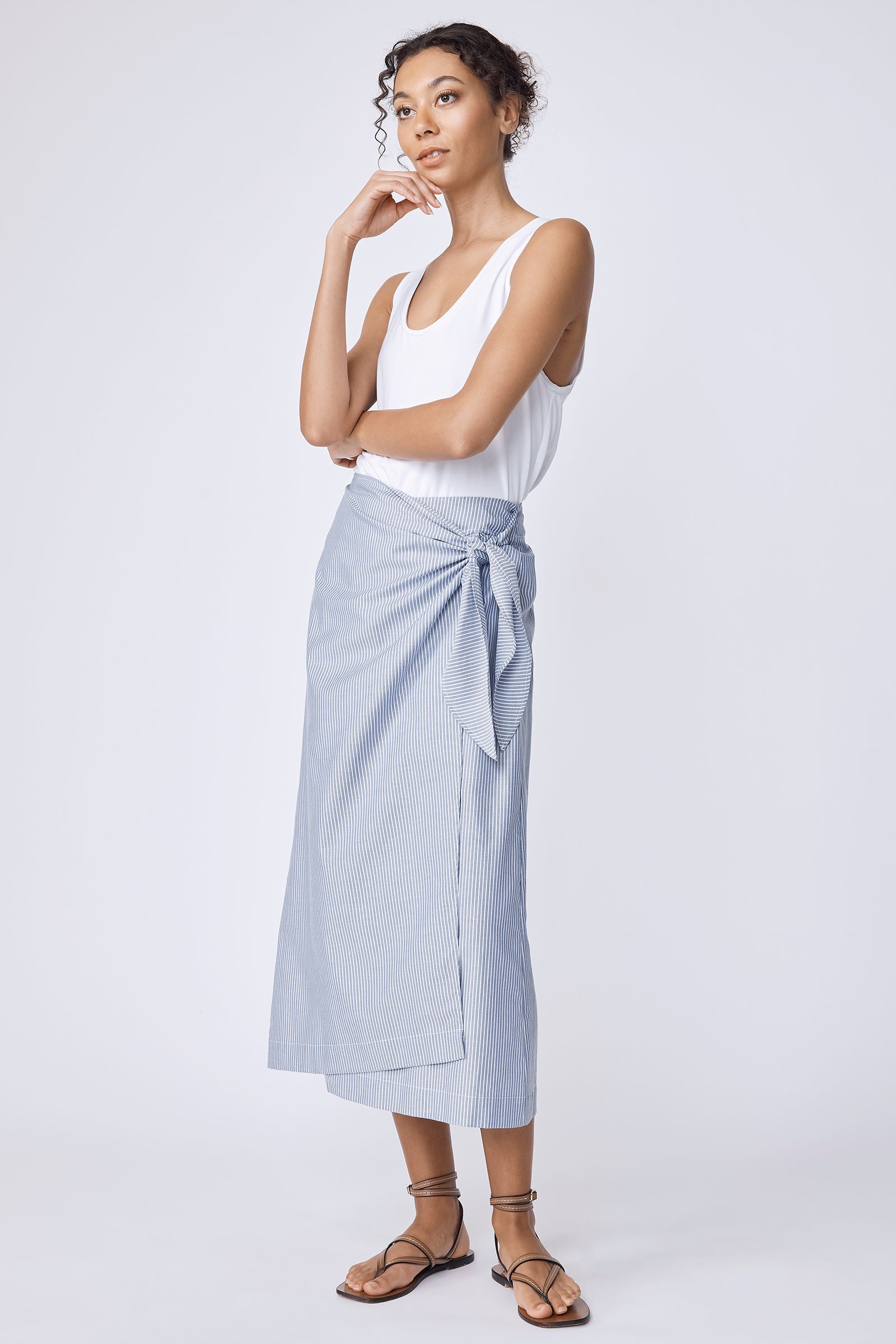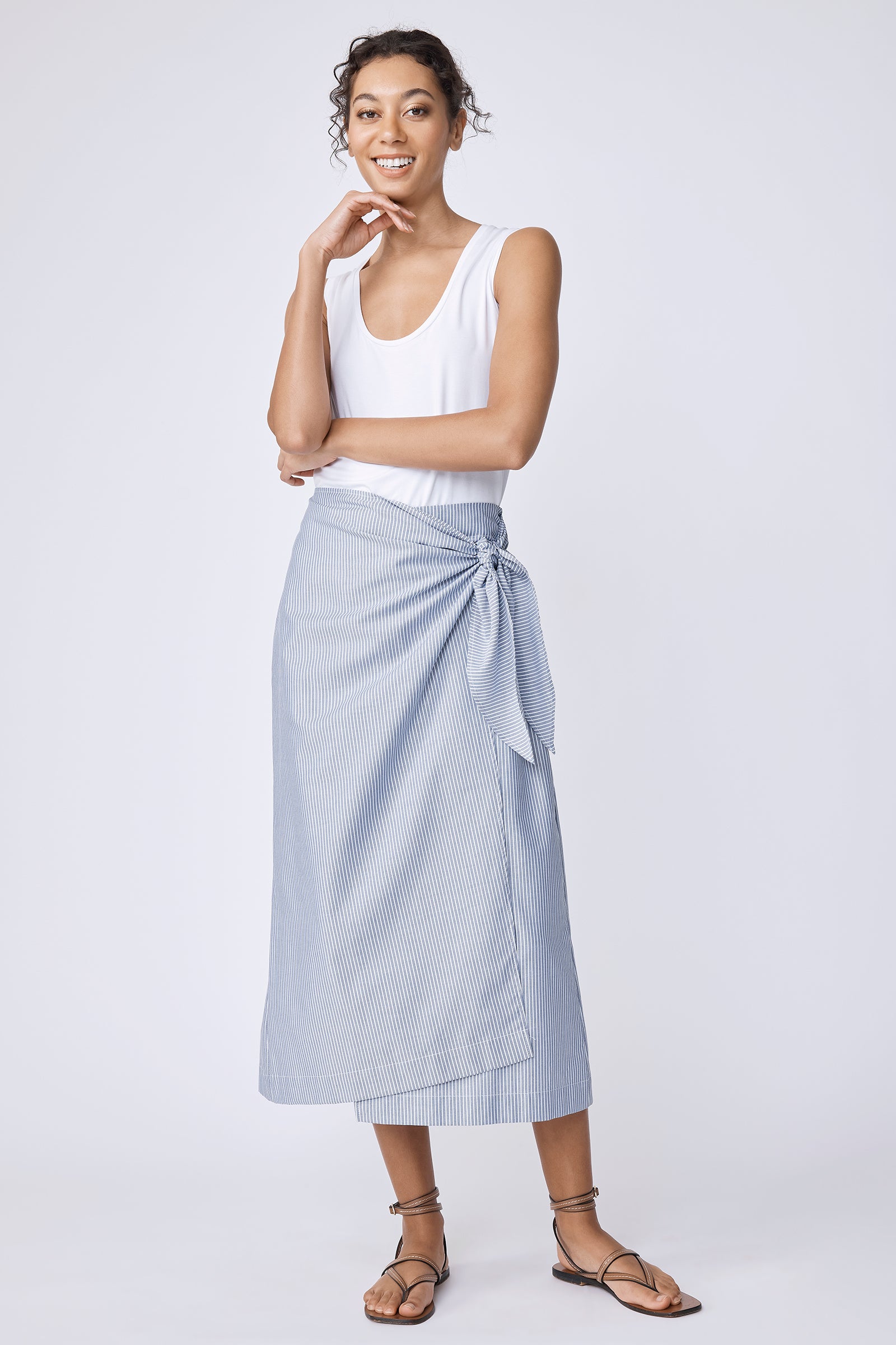 The Lorraine Wrap Skirt, finished in our new Harbor Stripe, is designed for effortless vacation dressing. Easy to style up or down, it pairs just as well with sandals as it does with sneakers, depending on the day (or the plan). Wear it with our bamboo jersey Sandra Scoop Tank for an easy, pulled-together look that travels well and wears even better.