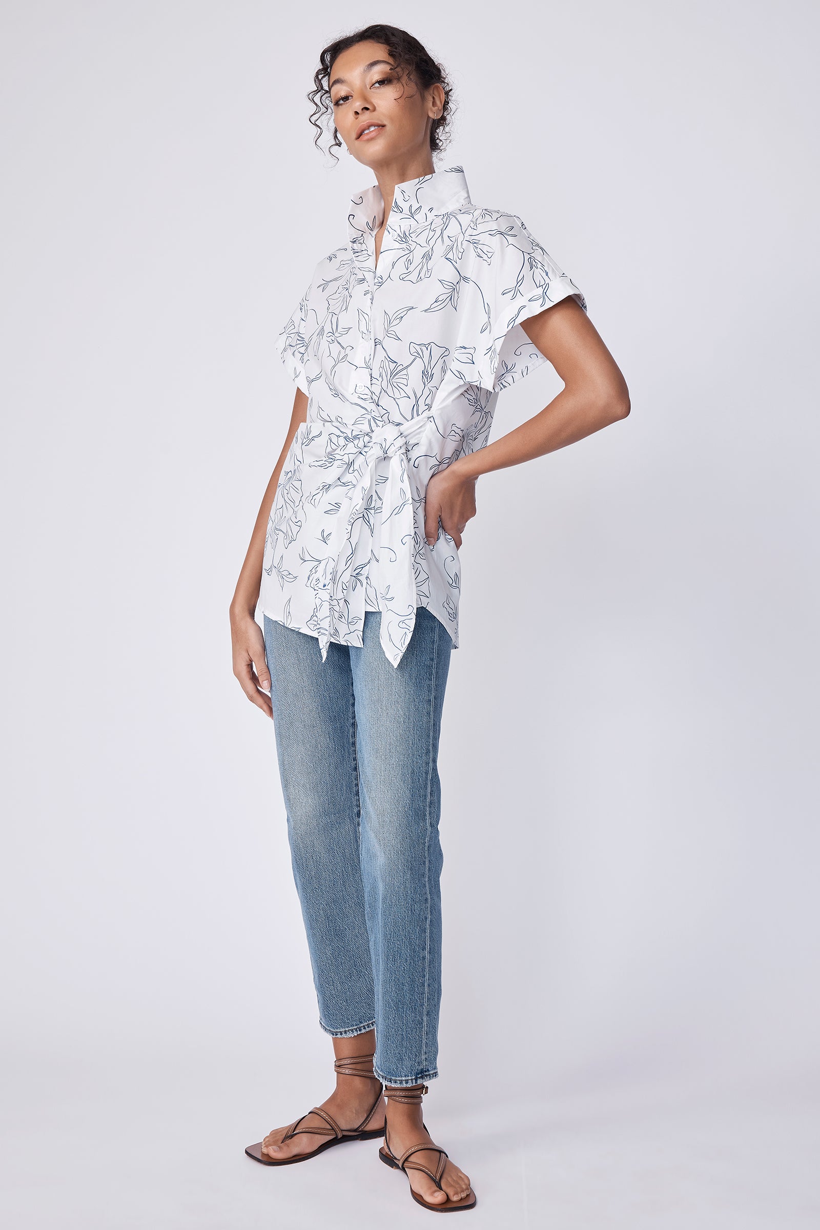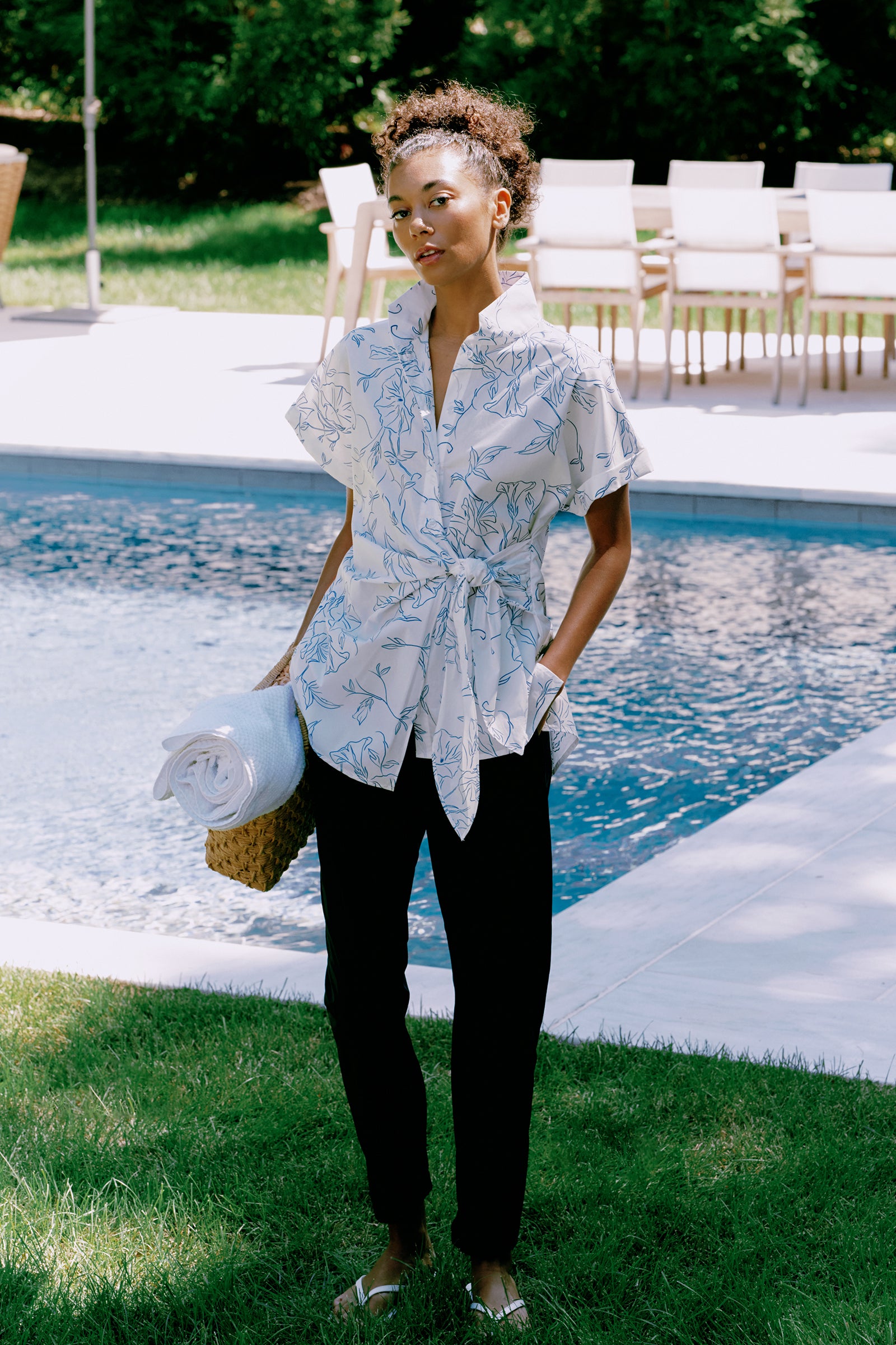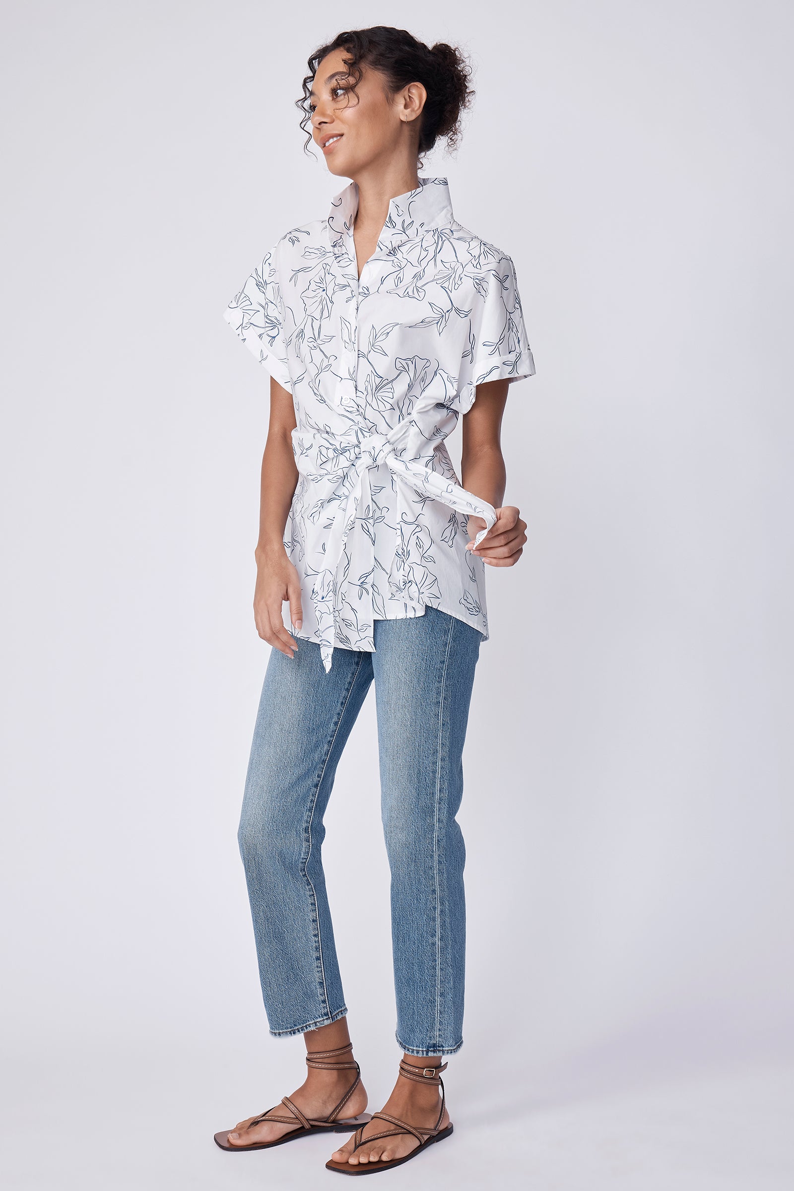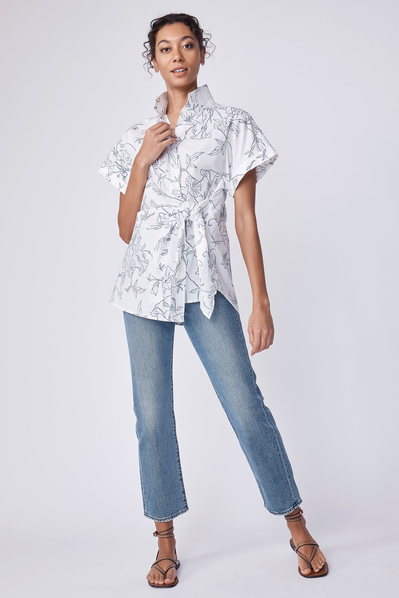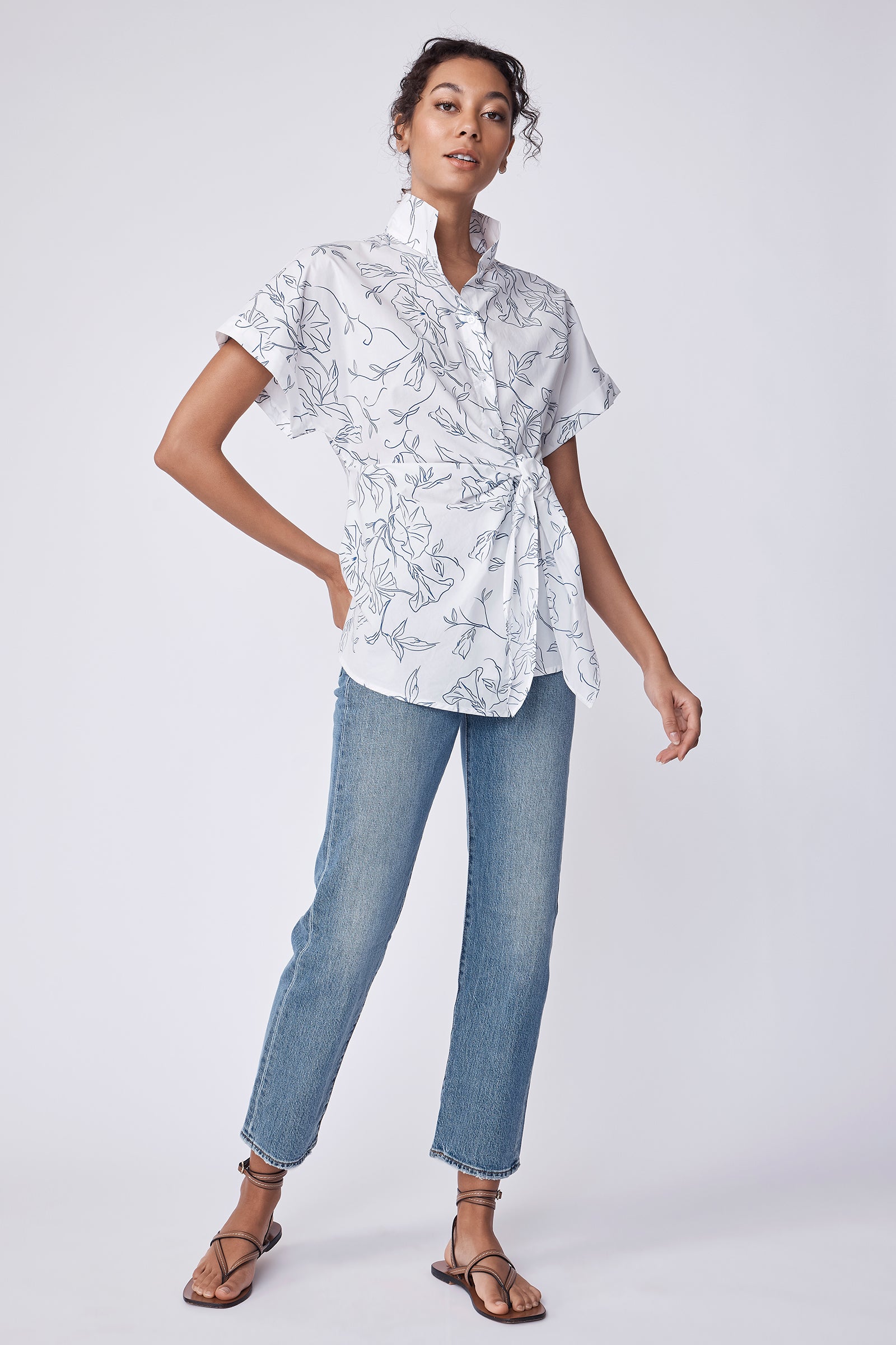 A flattering wrap silhouette that solves the “what to wear on vacation” dilemma. The Mila Wrap Top transitions seamlessly from poolside gatherings to evenings out, with a side-tie detail that allows for an adjustable, comfortable fit. Finished in our seasonal Vine Print, it pairs easily with navy bottoms or classic denim for relaxed yet polished styling.