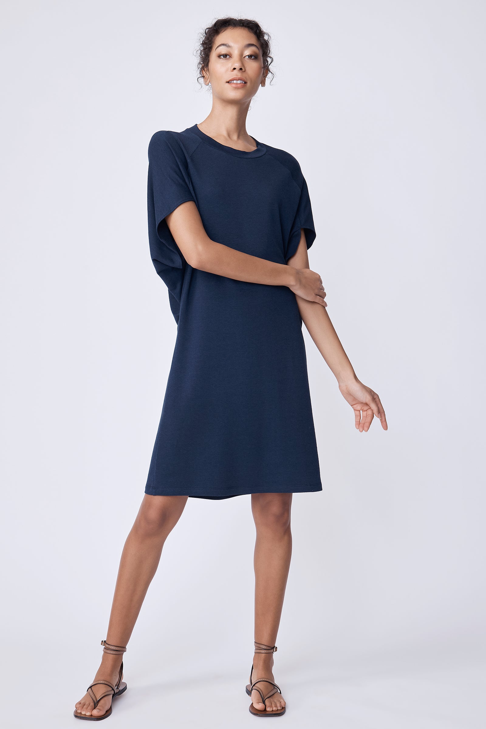 Crew neckline with 1" band, cape sleeve detail, clean finish hem