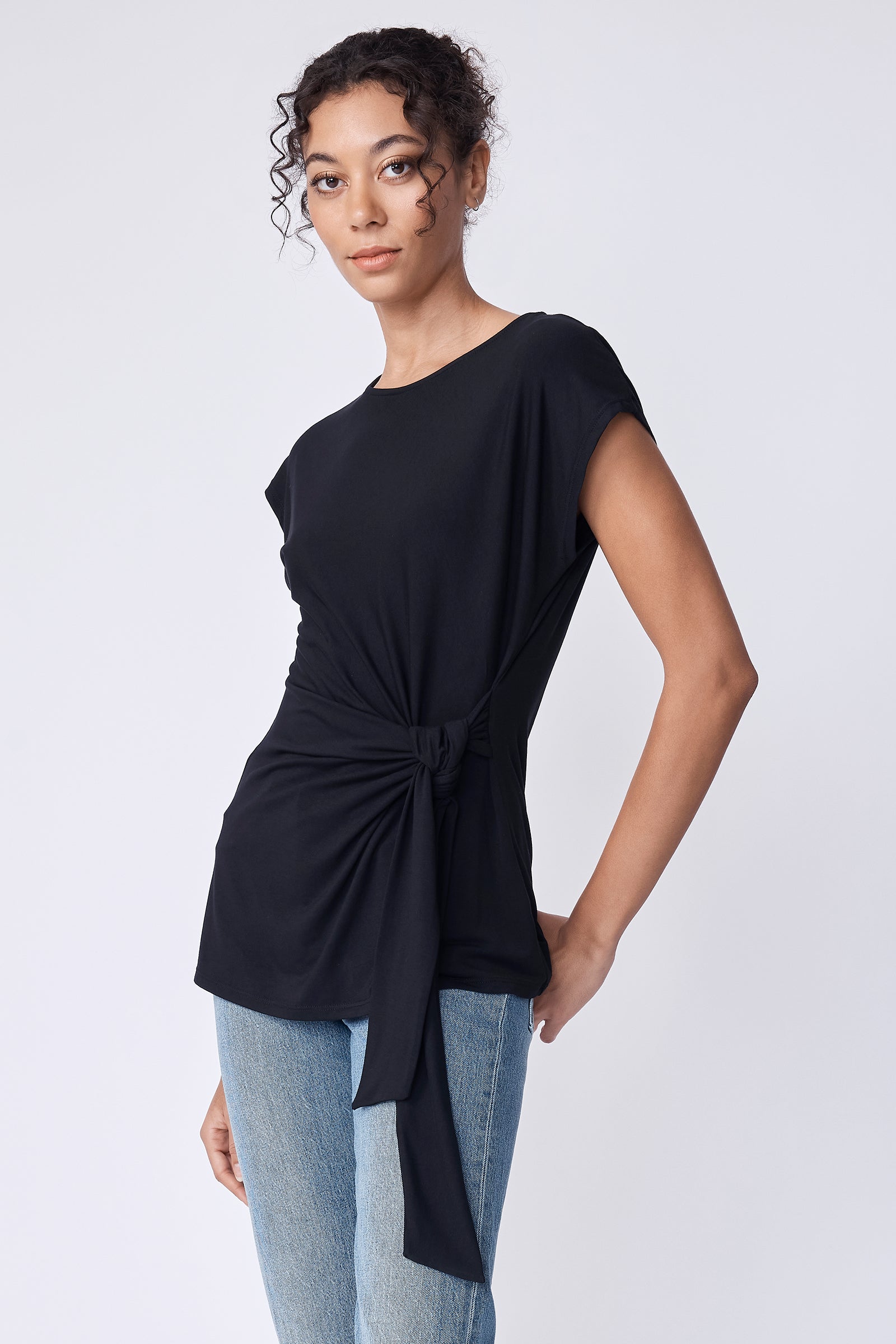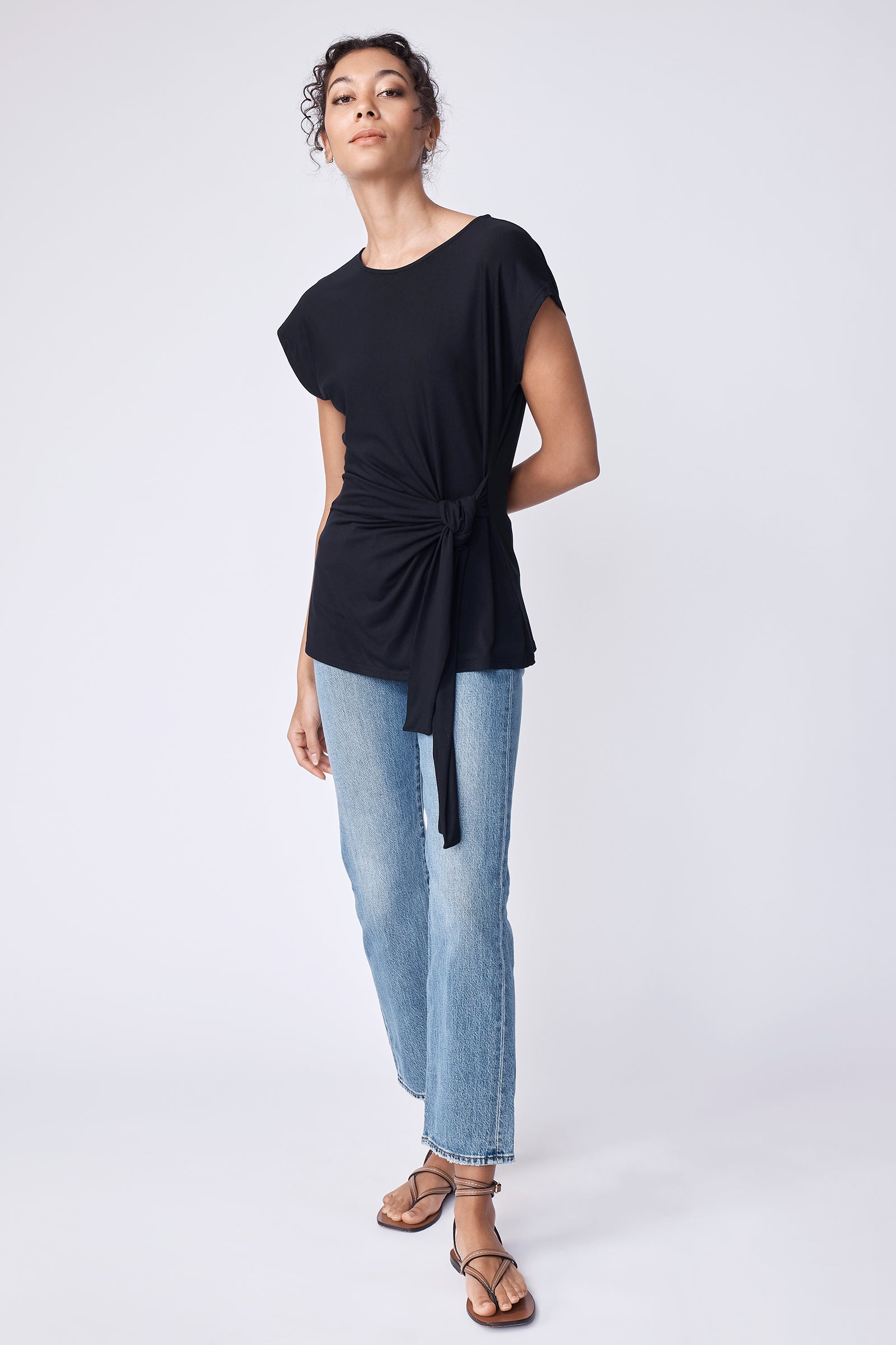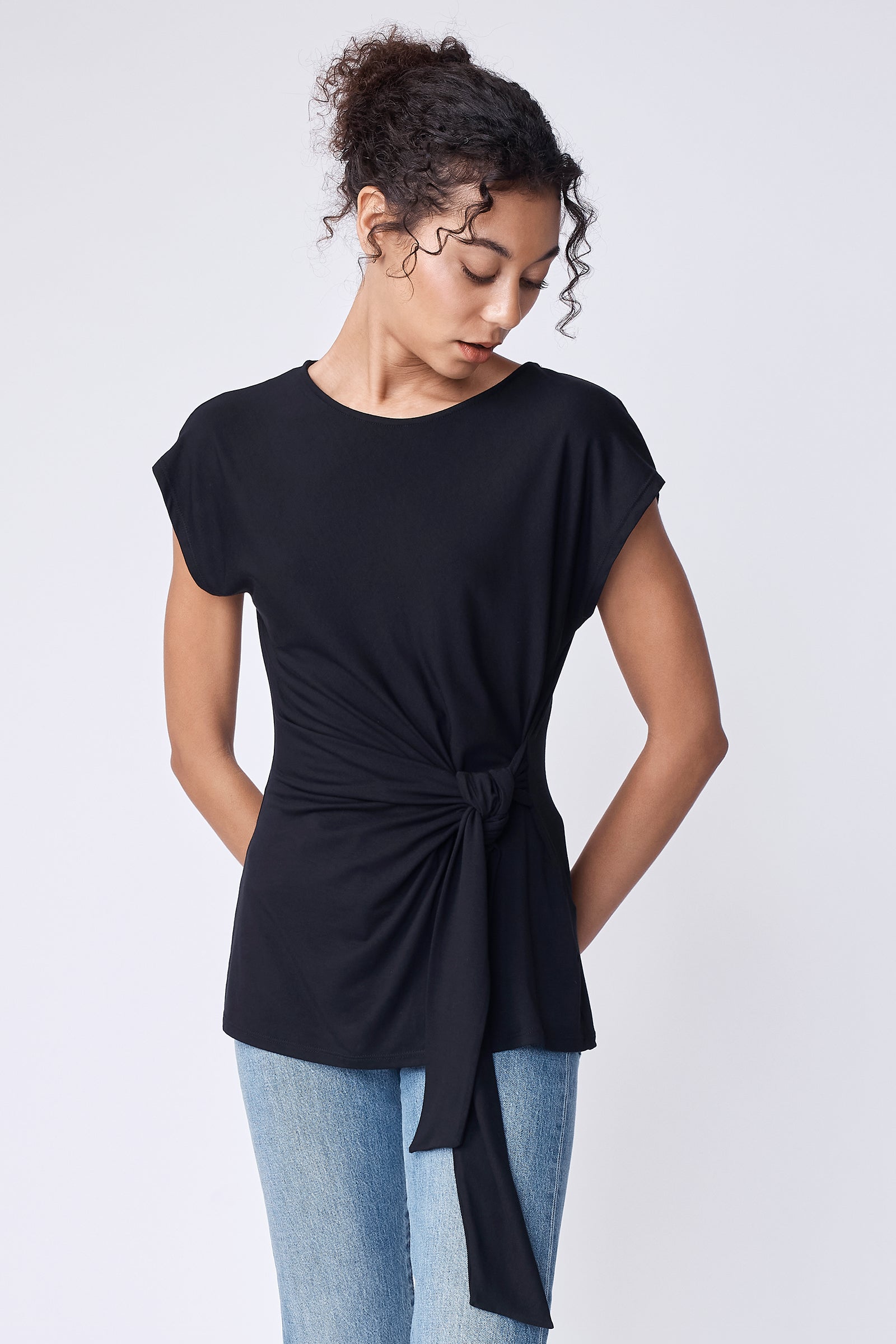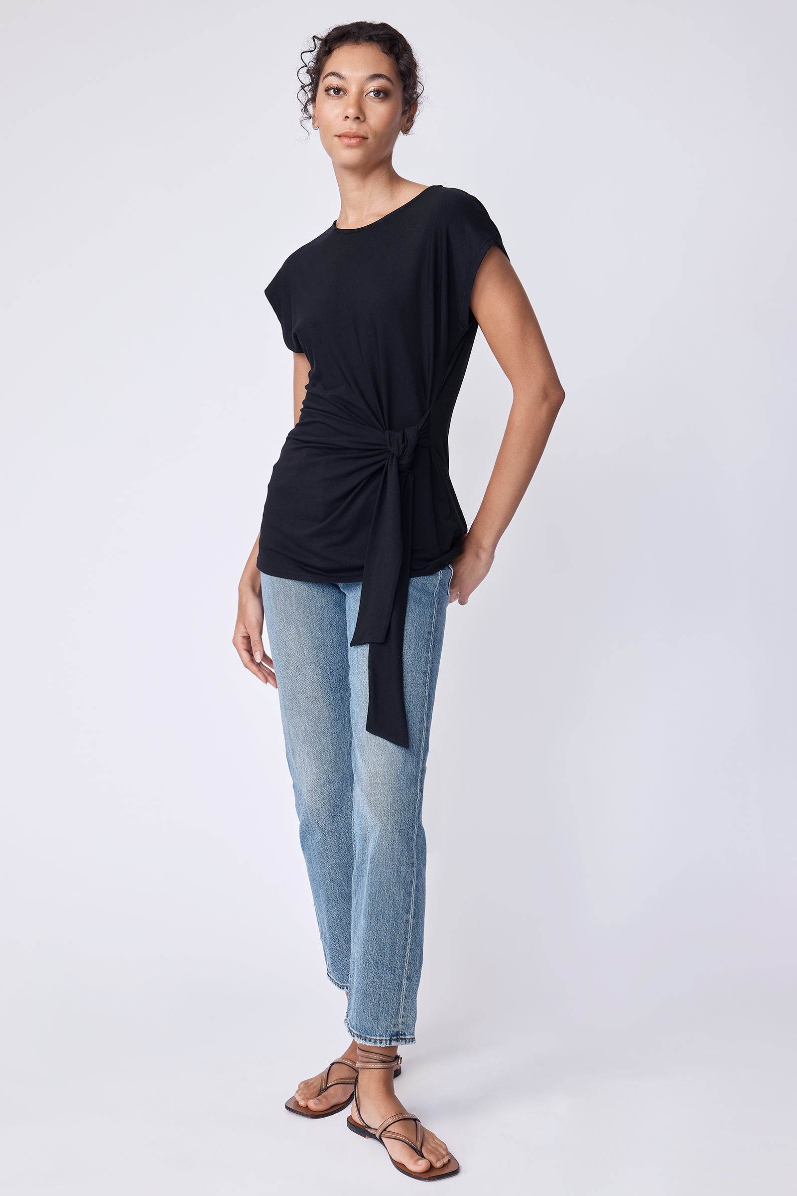 Open crew neckline, cap sleeve fit, side tie detail, clean finish straight hem