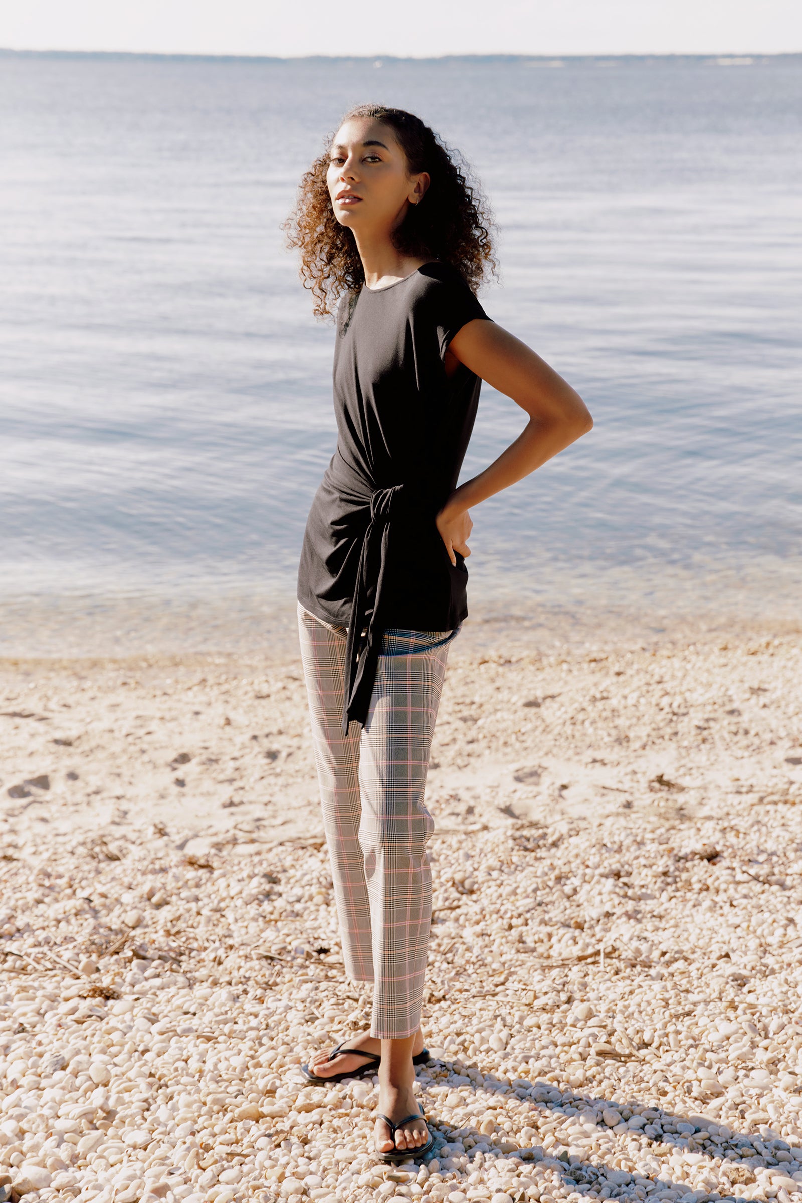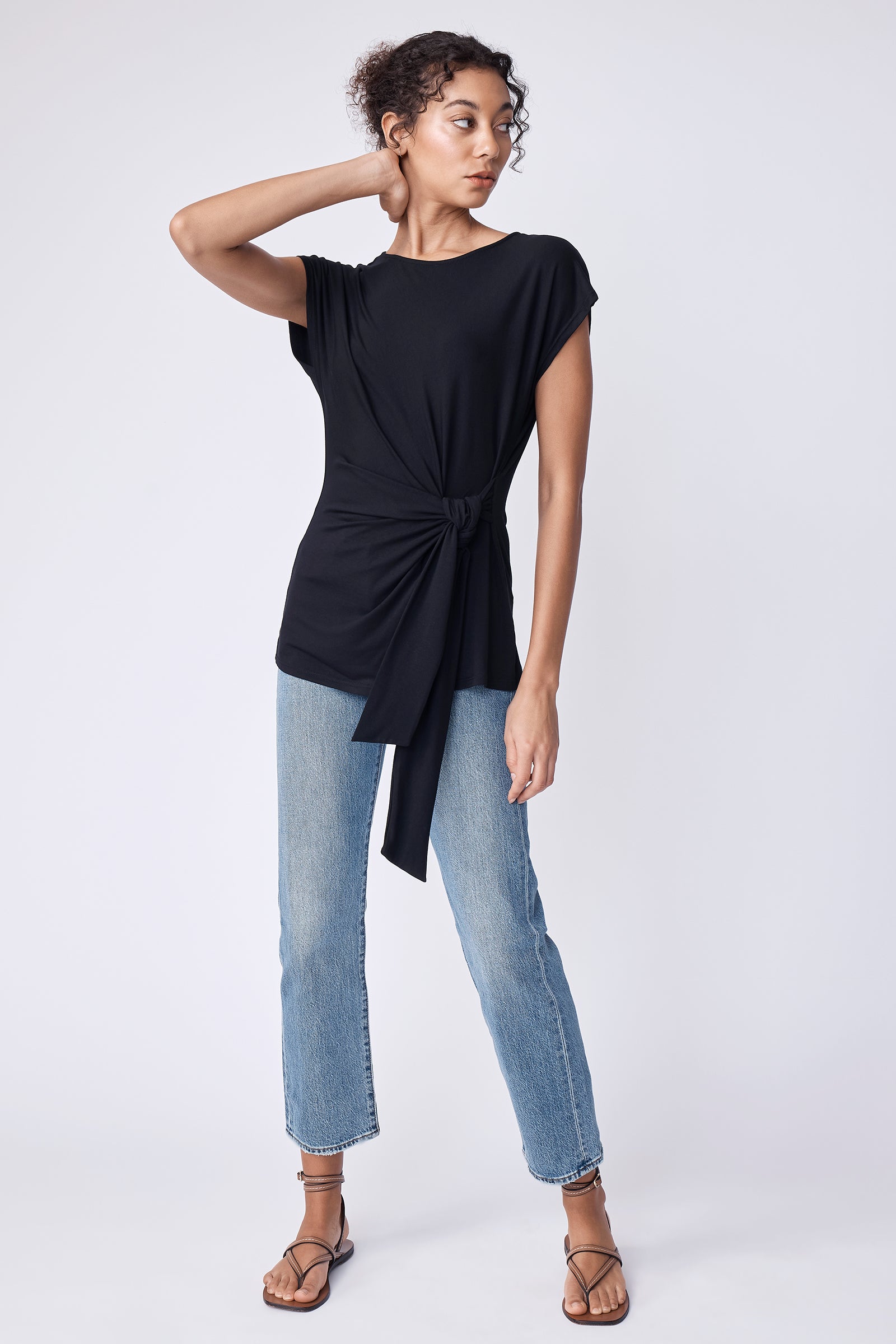 The Rebecca Tie Top is made in soft, breathable bamboo jersey and brings a little extra attitude to your everyday tee. The side tie detail adds interest and a flattering shape on any figure, so you can throw it on with jeans, trousers, or skirts and still feel like you planned it.